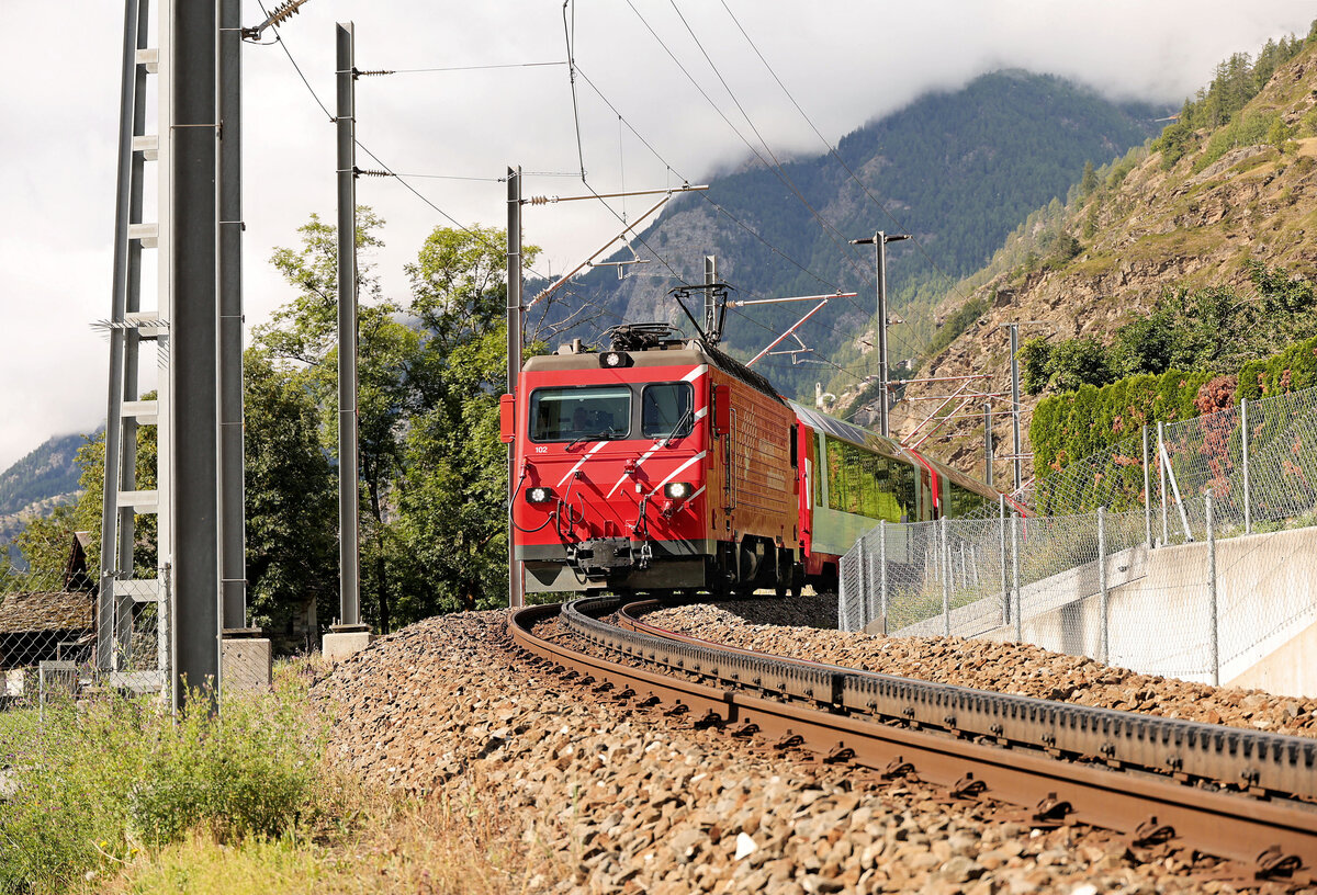 MGB Glacier-Express mit Lokomotive HGe4/4 II 102 auf der Zahnstange oberhalb Stalden. 30.August 2025