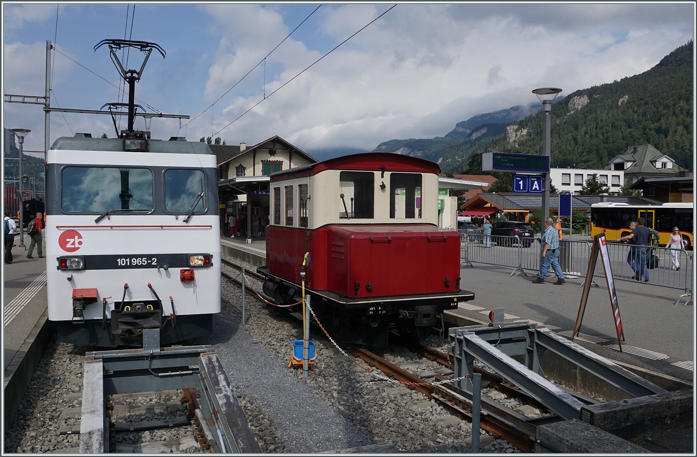 In Meiringen, neben der relativ kleinen  TRUDI  der (ex) MIB steht die Brünigbahn HGe 101 965-2, welche in ihrer Farbgebung auf 20 Jahre Zentralbahn hinweist.