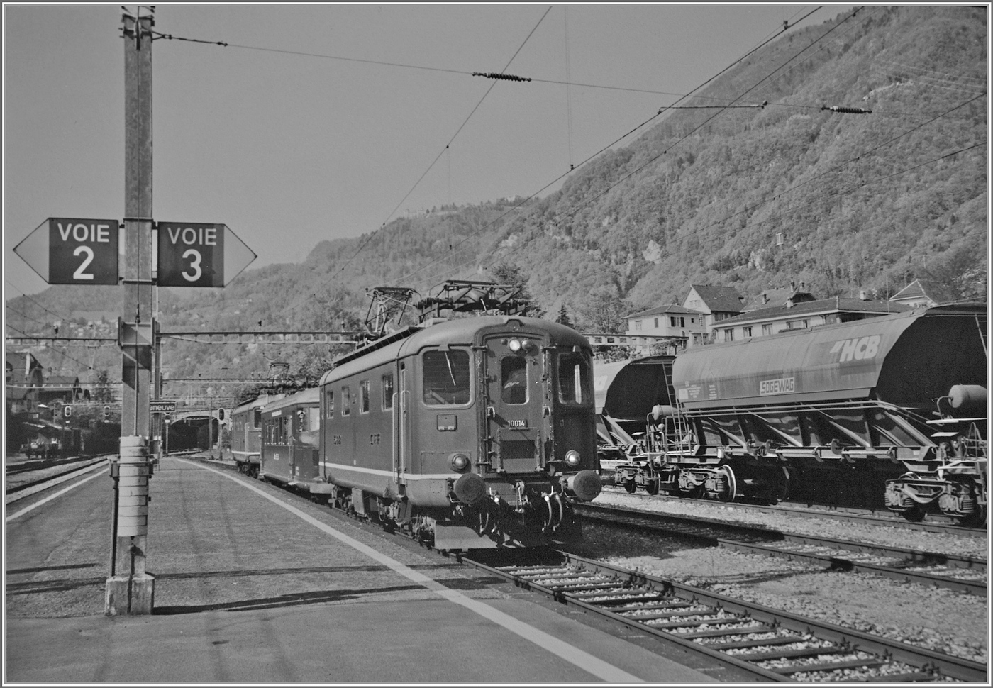 Während eine SBB Re 460 mit einem EC in Richtung Milano unterwegs ist und in Villeneuve durchfährt, waren zwei Ae 4/7 in Vielfachsteuerung mit einem Güterzug auf die Abfahrt