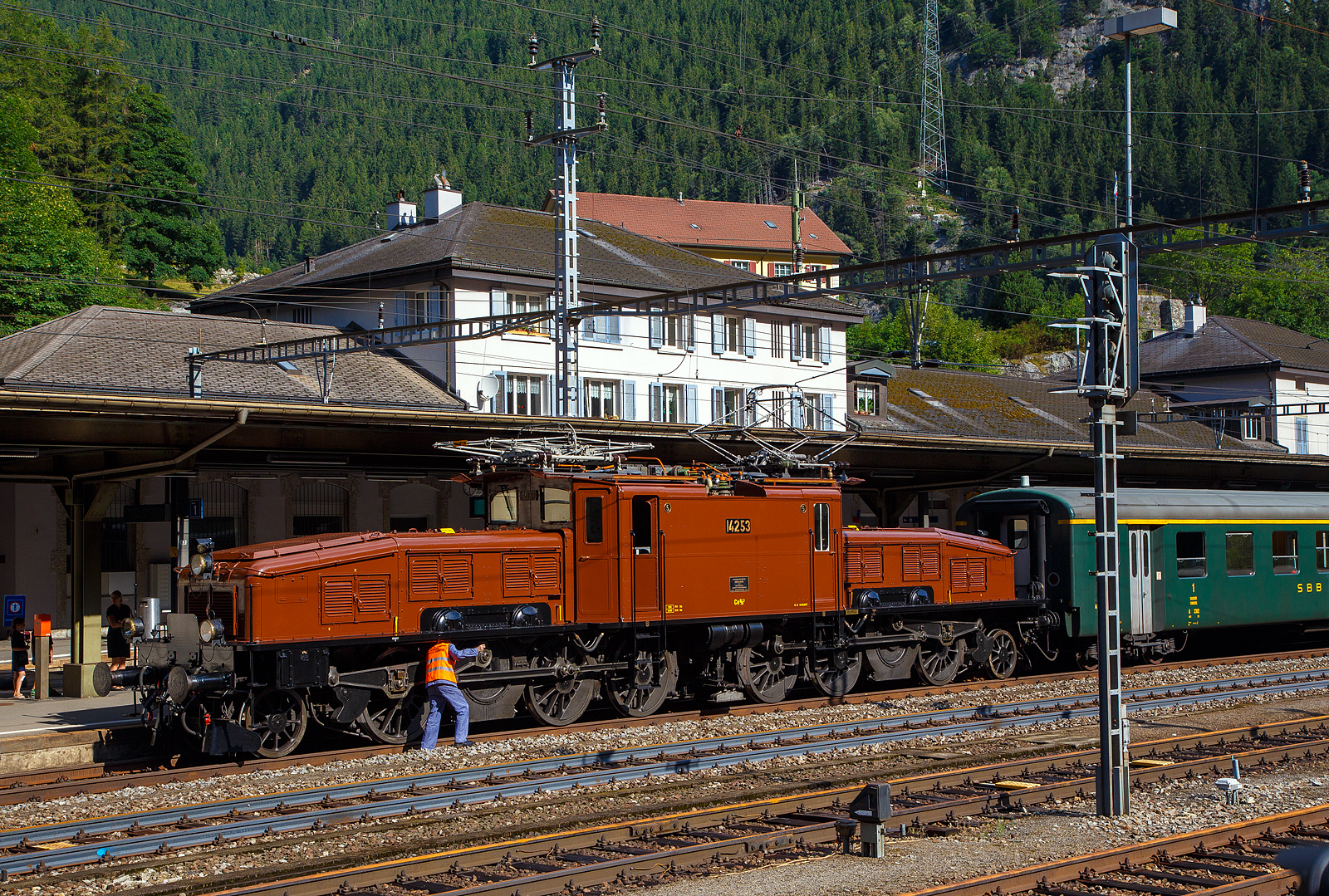 Das SBB Gotthard Krokodil Ce 6/8 II 14253 (eigentlich SBB Be 6/8 II 13253) der SBB Historic am 02.08.2019 mit einem Sonderzug im Bahnhof Göschenen. Wie eine Dampflok müssen auch bei einer solchen E-Loks mit Stangenantrieb die Lagerstellen gut geschmiert werden.