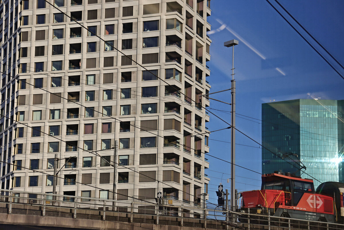 Die 3 Routen zwischen Zürich und Oerlikon: Auf der Brücke, die von  Hardbrücke  Richtung Käferberg und Oerlikon führt, rangiert eine Komposition mit der kleinen Ee 922 009. Aufnahme bei baldigem Untergang der Sonne aus einem von Zürich wegfahrenden Zug (daher die Spiegelungen). 5.März 2025