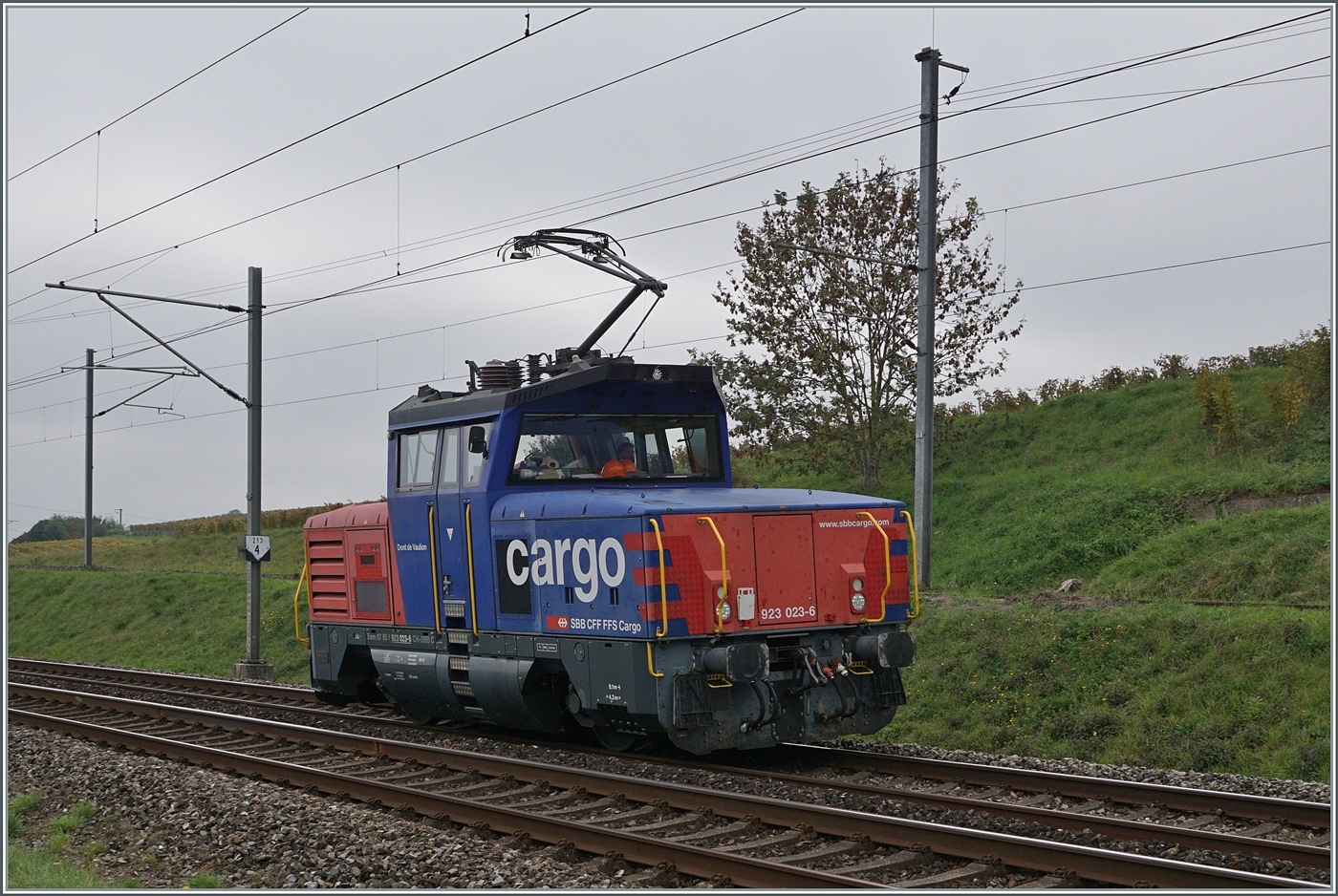 Die Eem 923 023-6 Dent de Vaulion ist kurz vor Auvernier auf der Fahrt in Richtung Neuchâtel. Einige Zeit vorher haben wir die Lok mit einen Güterzug in der Gegenrichtung fahren sehen. 8.Oktober 2025
