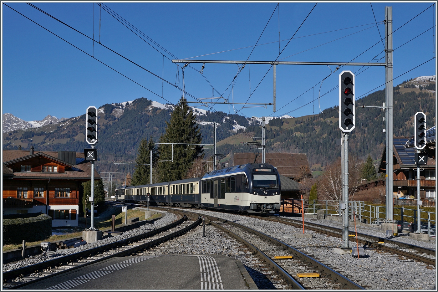 Da in Gstaad gekreuzt wird, kommt gleich darauf der Gegenzug, geschoben von der MOB Ge 4/4 8001. 30. Nov. 2024