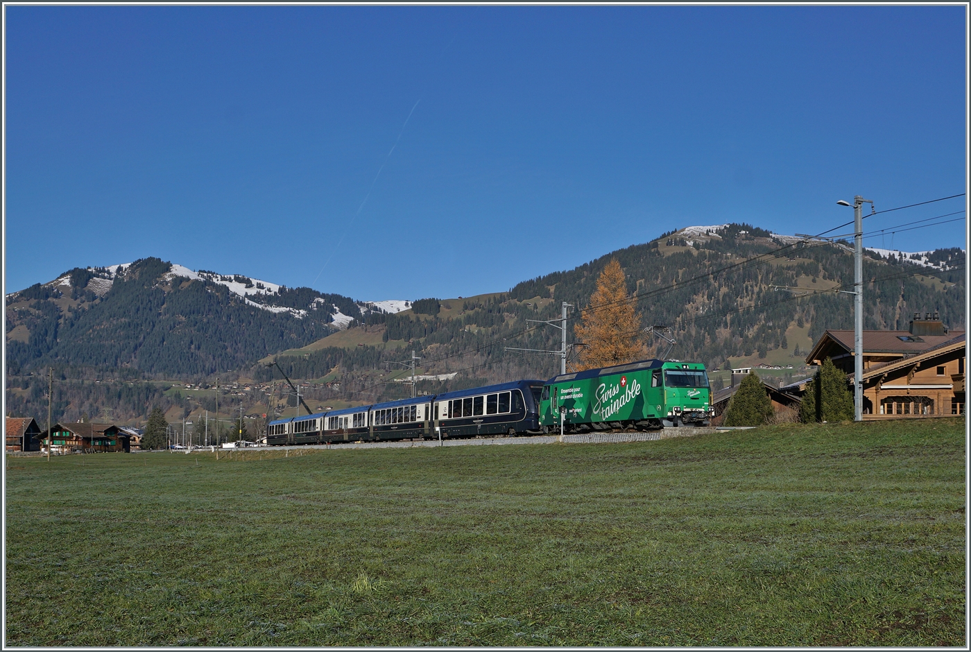 Zwischen Saanen und Gstaad ist die MOB Ge 4/4 8004  Swiss Tainable  mit ihrem GoldenPass Express GPX 4068 auf dem Weg von Montreux nach Interlaken Ost, wobei die Ge 4/4 8004 in Zweisimmen von einer BLS Re 465 abgelöst wird.