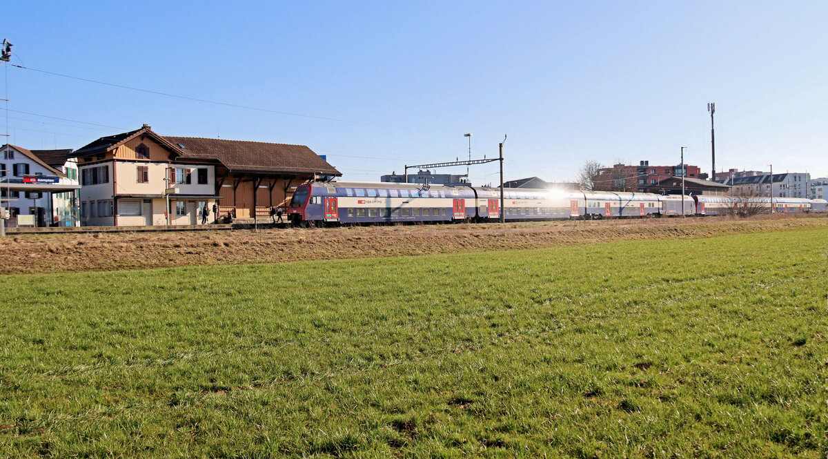 Die Kempttalbahn: Im Schilf- und Sumpfgürtel um den im Hintergrund sichtbaren Pfäffikersee. Ein S-Bahnzug der S3 (Zürich Hardbrücke - Wetzikon via Pfäffikon ZH) nähert sich Kempten. Geführt von Lok 450 053. 5.März 2025