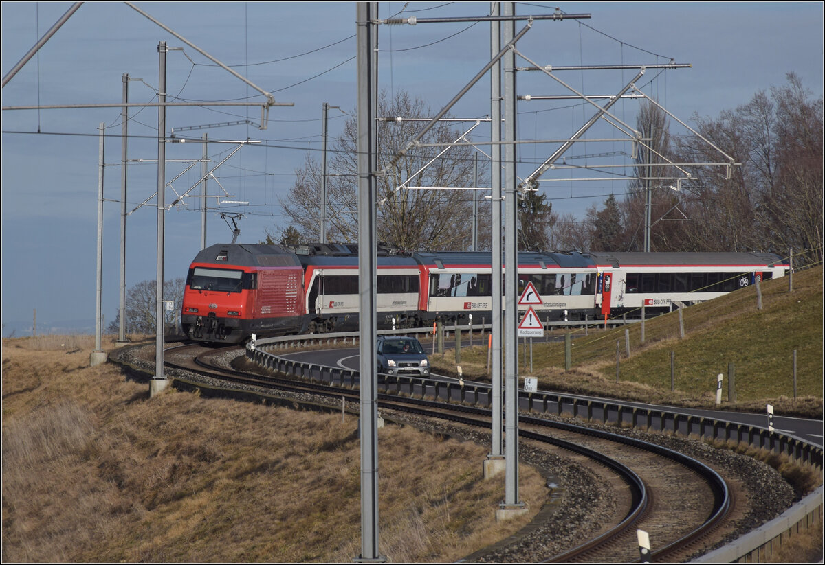 Zur Strafe für die Bemerkung langweilig schlich sich keine Minute später von hinten völlig unbemerkt direkt an uns diese Zugkomposition vorbei. Re 460 014 'Val de Trient', der Messtriebwagen XTmass 160 001, der Infrastrukturdiagnosewagen X 99 85 93-61 247-1 CH-SBBI und der IC-Steuerwagen Bt 50 85 28-94 918-5 CH-SBB. Diese Strafe ist wirklich annehmbar. Mittelhäusern, Januar 2026.