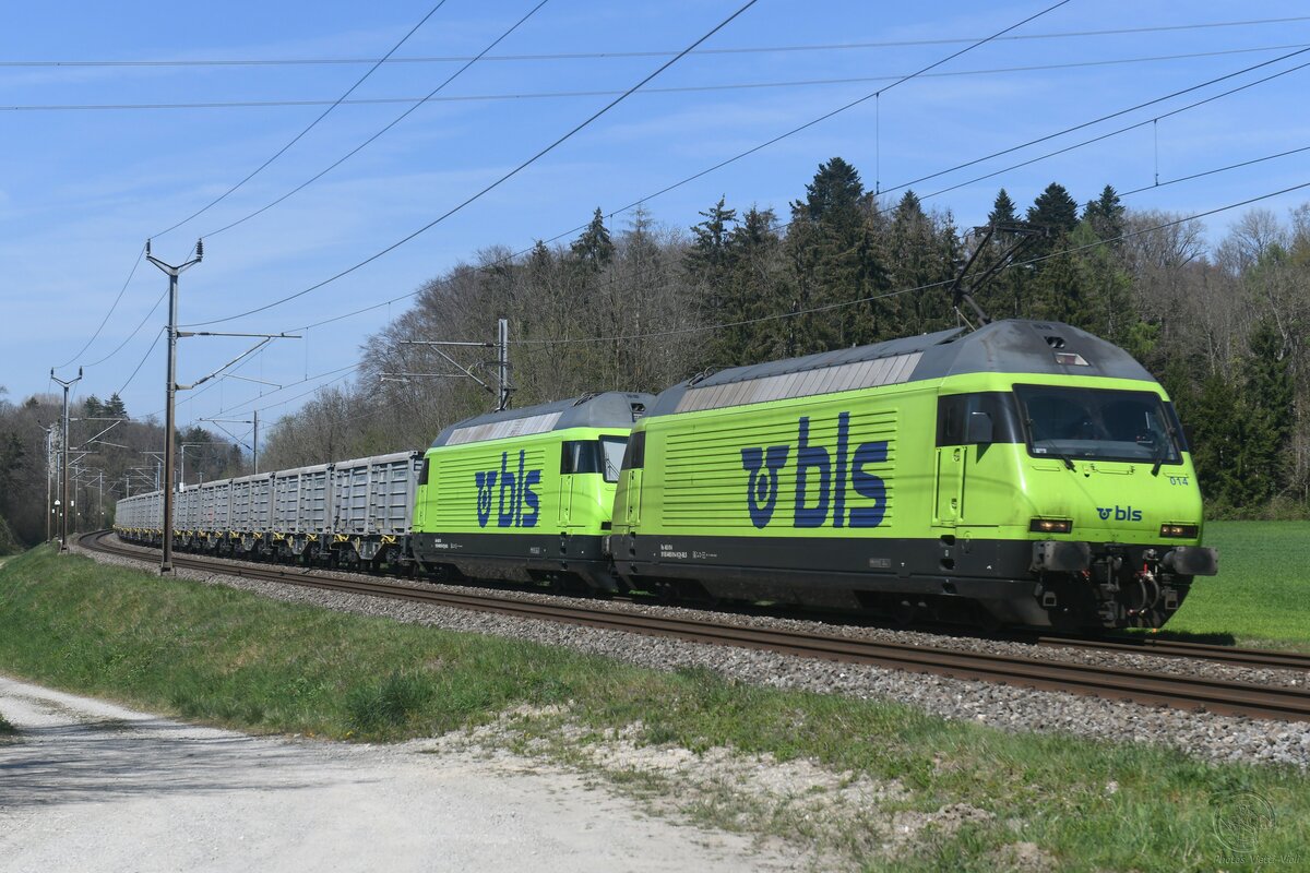 BLS: Doppeltraktion ALT und NEU in den Farben blau und braun bei Langenthal am 15. Juli 2015. An der Spitze des Zuges ist die Re 465 014-9 eingereihnt.