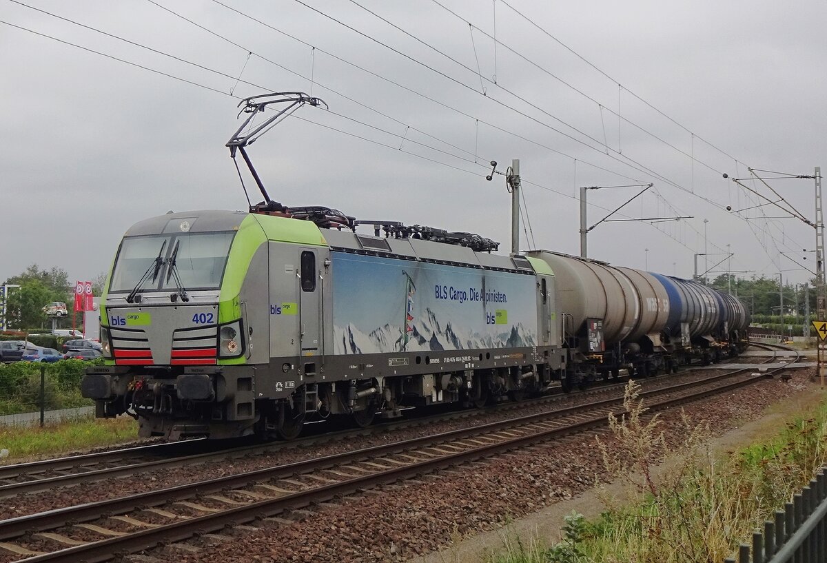 Bei der bekannte Bahnübergang in Hulten passiert am 5 Juni 2024 BLS 475 414 mit der aus Novara kommender Containerzug.