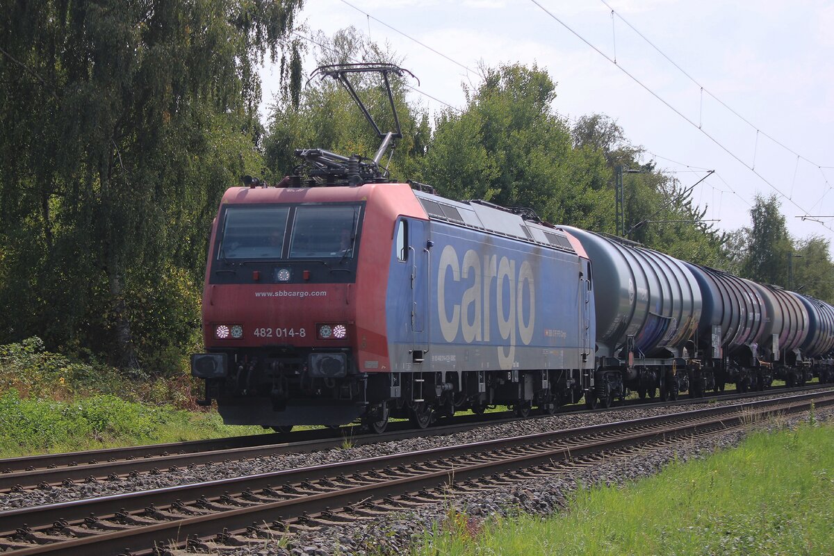 Am 23 Juli 2025 durchfahrt SBB Cargo 482 021 samt Kesselzug Kaarst-Broicherseite.