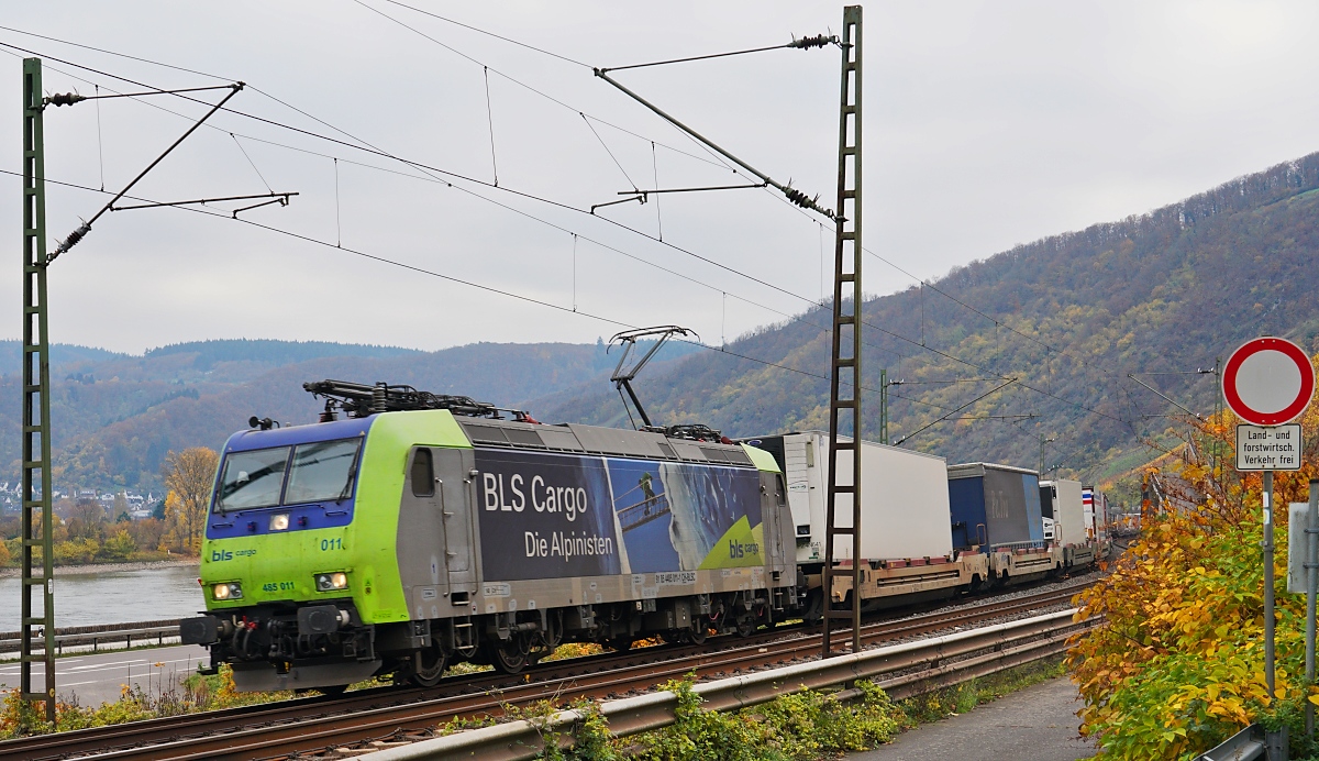 Die BLS-485 011 ist am 16.11.2024 unterhalb der Weinberge des Bopparder Hamms unterwegs in nördlicher Richtung