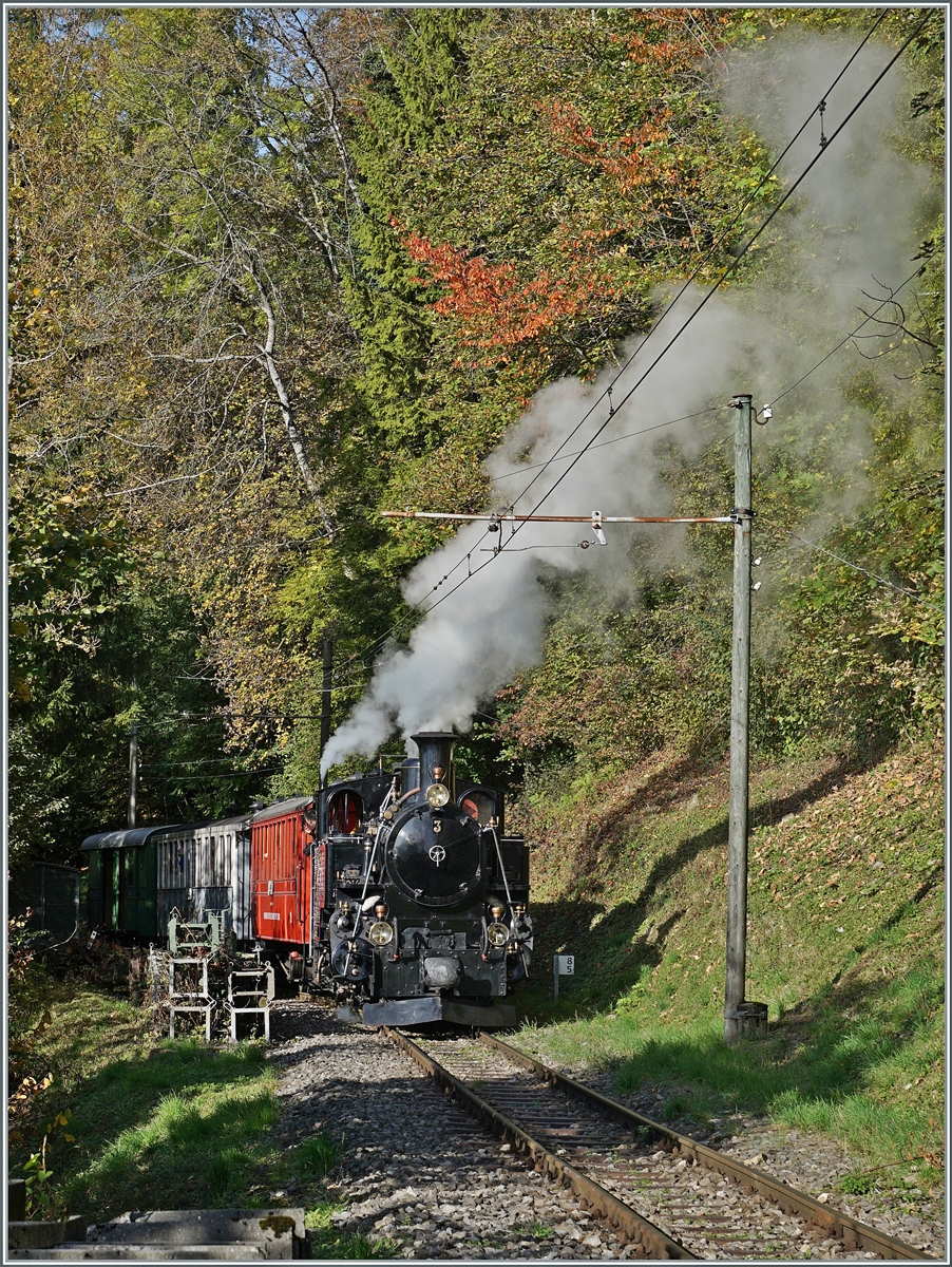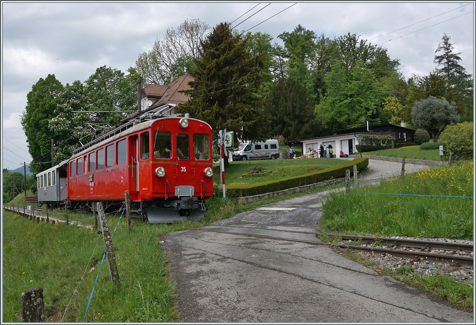 Die in Blonay abgestellte MOB GDe 4/4 6006 bietet einen schönen Hintergrund zum einfahrenden MOB BCFe 4/4 N° 11 der Blonay Chamby Bahn, der mit dem letzten Zug des Tages in den Bahnhof einfährt.