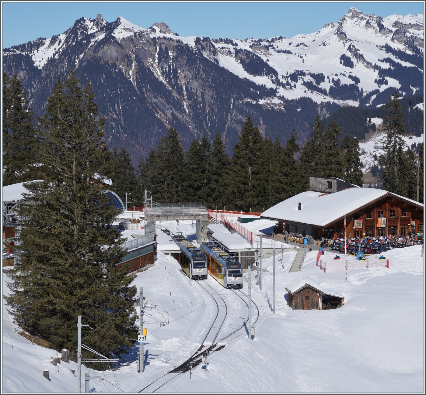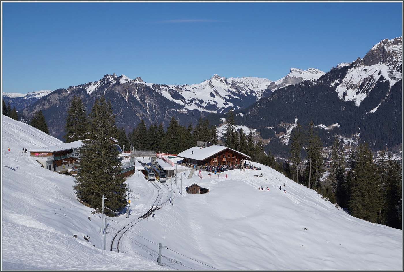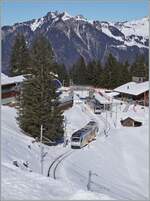 Der BLM Be 4/4 N° 31 (ex Bipperlisi) bei der Einfahrt in Mürren; eindrücklich der Blick in die tiefe Schucht rechts im Bild.