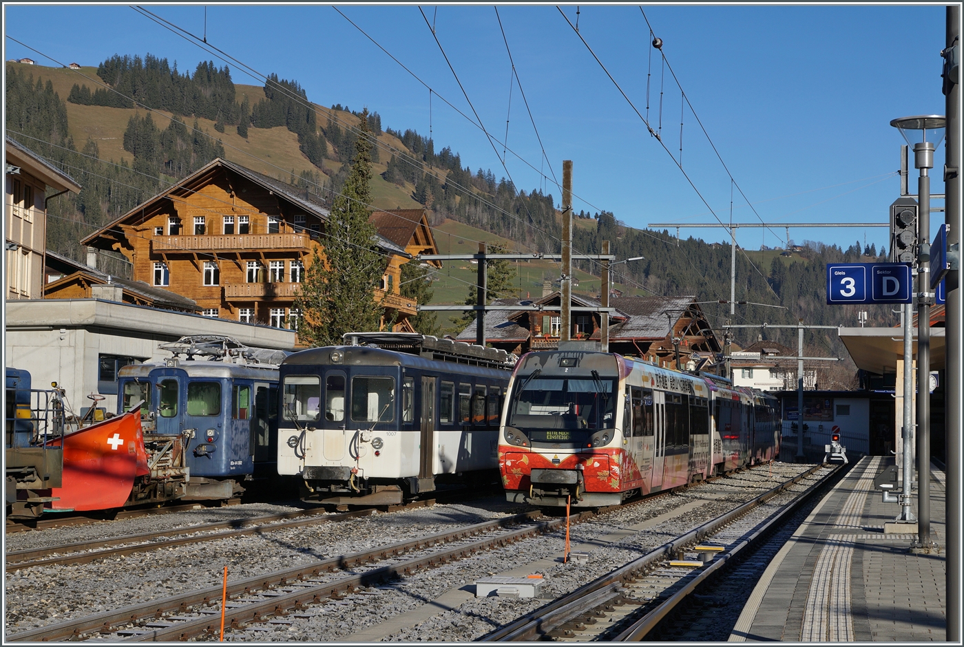 Bunte MOB in Zweisimmen: der MOB Lenkerpendel Be 4/4 5002 "Nankai", der Be 4/4 1007 "Bipperlisi" und BDe 4/4 302. 30. Nov. 2024