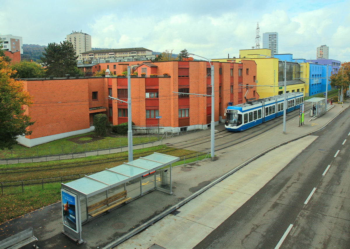 Zürich Hirzenbach: Vor sehr farbigen Häusern wird Cobra 3050 gleich zur Endstation abbiegen. 17.Oktober 2020