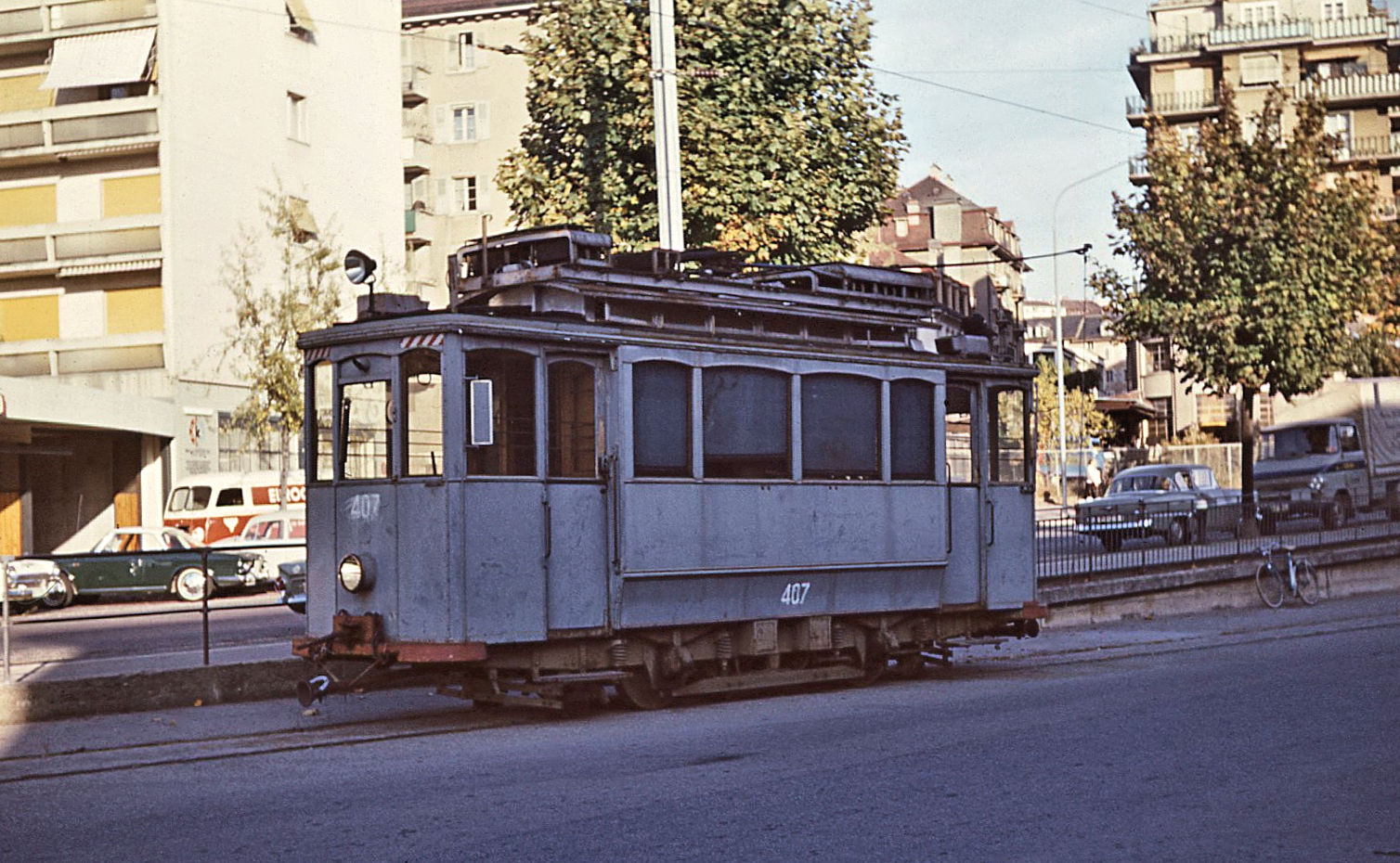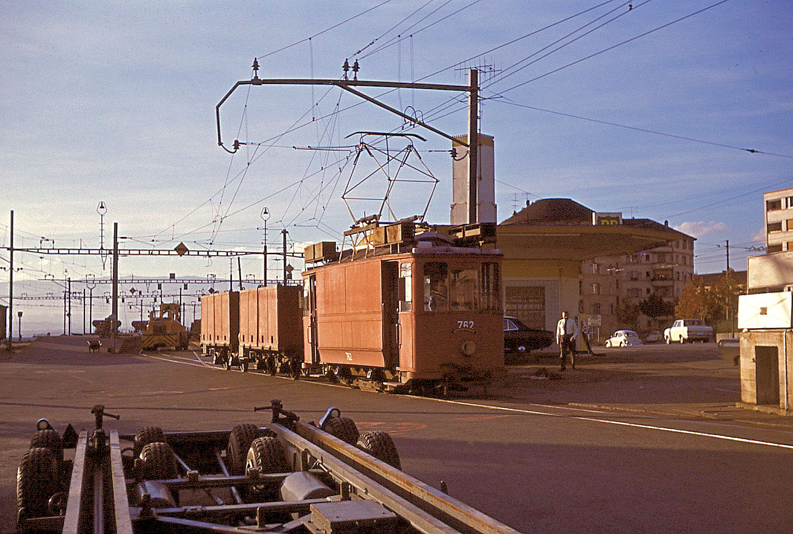 Ueberfuhr von der LEB in Lausanne Chauderon zur Umladestelle in Sébeillon: Wagen 751 ist von der LEB in Lausanne Chauderon mit zwei Zuckerrübenwagen zum Umschlagplatz Lausanne Sébeillon heruntergekommen. Einst VBZ Zürich 1167, dann Tramway de Lausanne 409 (so weit ich herausfinden konnte). 16.Oktober 1967