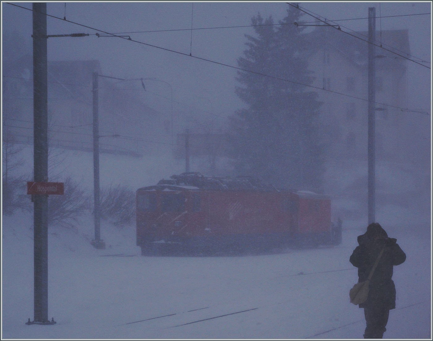 Bei heftigem Schneefall fotografierte ich in Hospental eine der beiden MGB Ge 4/4 III 81/82 und den Xrot 4923, welche wohl bald zum Einsatz kommen werden.