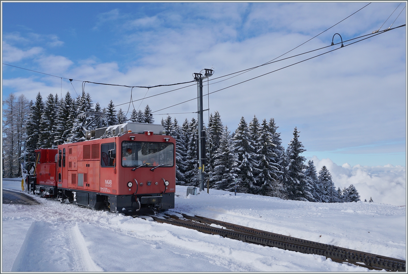 Es hat geschneit und die HGem 2/2 2501 mit dem X464 ist zur Schneeräumung auf den Les Pléiades gefahren. Das Bild zeigt die HGem 2/2 2501 nach getaner Arbeit beim Verlassen der Gipfelstation Les Pléiades in Richtung Blonay fahrend.