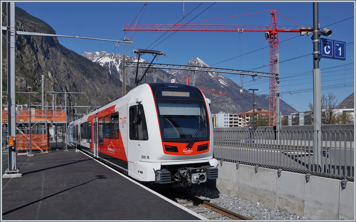 Im neu gestalteten Bahnhof von Martigny (TMR) ist der neue TMR Beh 4/8 91 bzw. SNCF 891 (90 85 838 0891-4) auf einer Testfahrt. Leider fuhr der Zug nur knapp bis hinter das Ausfahrtsignal statt bis zum Prellbock, so dass dieses Bild nicht ohne störende Elemente zustande kam. 9. April 2026