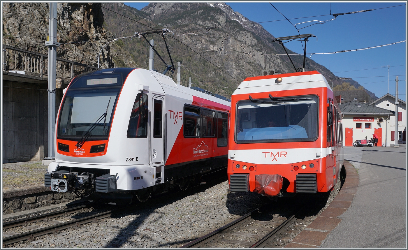 In Vernayaz M-C begegnet der TMR Beh 4/8 72 (UIC 90 85 838 072-4 CH-TMRSA) dem neuen TMR/SNCF Beh 4/8 (90 85 838 0891-4). Während letzterer als Regionalzug 18977 auf dem Weg von Vallorcine nach Martigny ist, werden mit dem neuen Beh 4/8 91 Testfahrten zwischen Vernayaz MC und Martigny unternommen. 9. April 2026