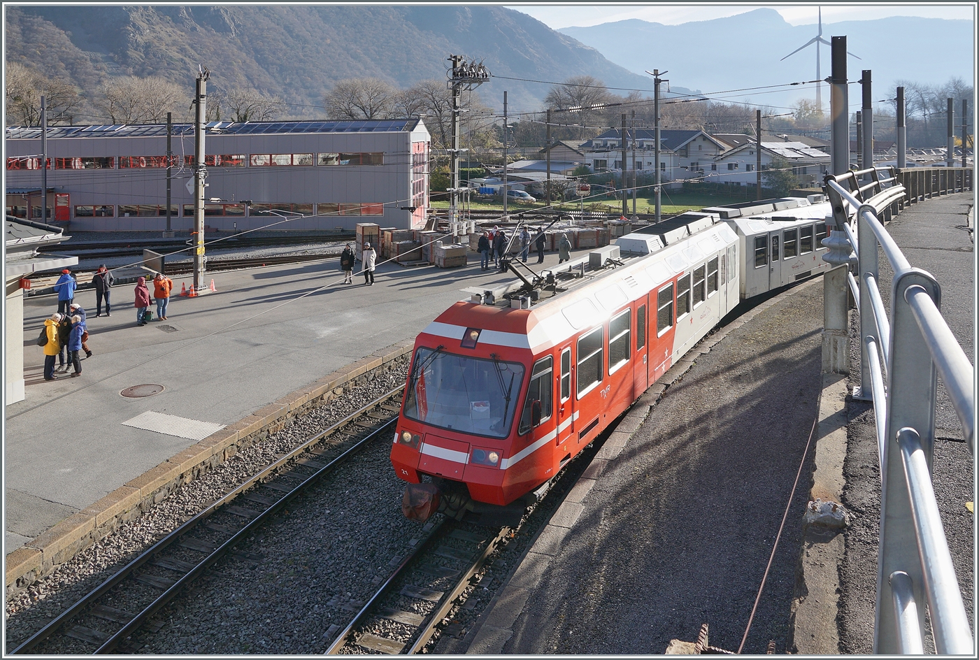 Während dem Umbau des M-C Bahnhof in Martigny wurde die Strecke Vernayaz M-C Martigny im SEV bediente und die TMR Züge starteten oder endeten in Vernayaz M-C. Das war einerseits eine gute Gelegenheit die nun dort etwas länger stehende Züge zu fotografieren, andererseits aber auch mit der Erfahrung verbunden, dass es in Vernayaz M-C gar nicht so einfach, die Züge ins Visier zu nehmen, besonders, wenn diese auf Gleis 2 stehen, wie diese Bild des TMR BDeh 4/8 N° 21 zeigt. 19. Nov. 2025