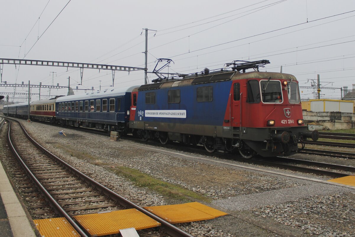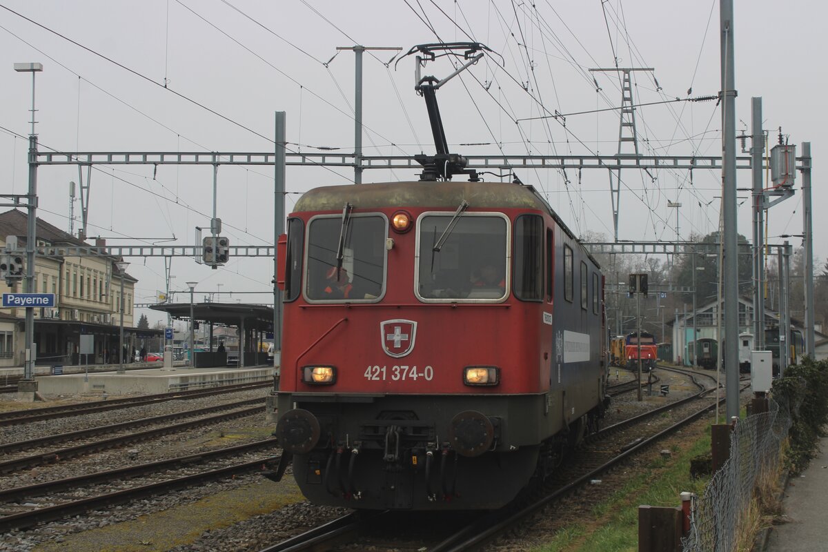 Ex-SBB Cargo, heute in Dienst von SSG: 421 374 steht am Sylvester 2024 samt deren Sonderzug in Payerne und wird vom ofenbarer Stelle fotografiert.