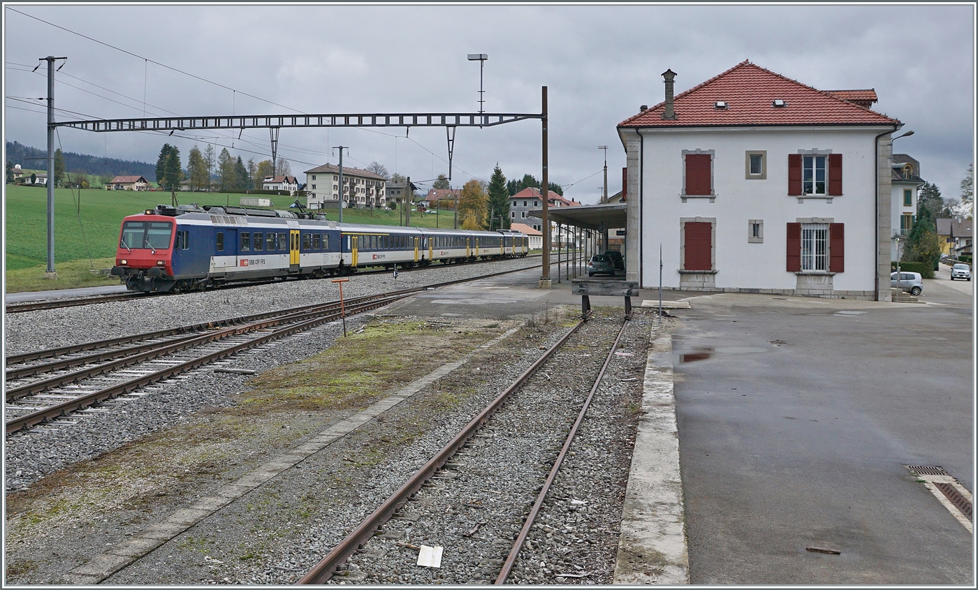 Der RBDe 562 004-2 als RE 18124 von Neuchâtel nach Frasne bestehend aus folgenden Fahrzeugen: RBDe 562 004-2, AB 50 85 30-603-1, B 50 85 20-35 600-9, B 50 85 20-35 602-5 und dem Bt 50 85 29-35 952-5, bei der Einfahrt in Champs-du-Moulin, eine Station, die der RE ohne Halt durchfährt.