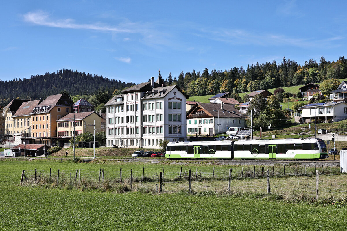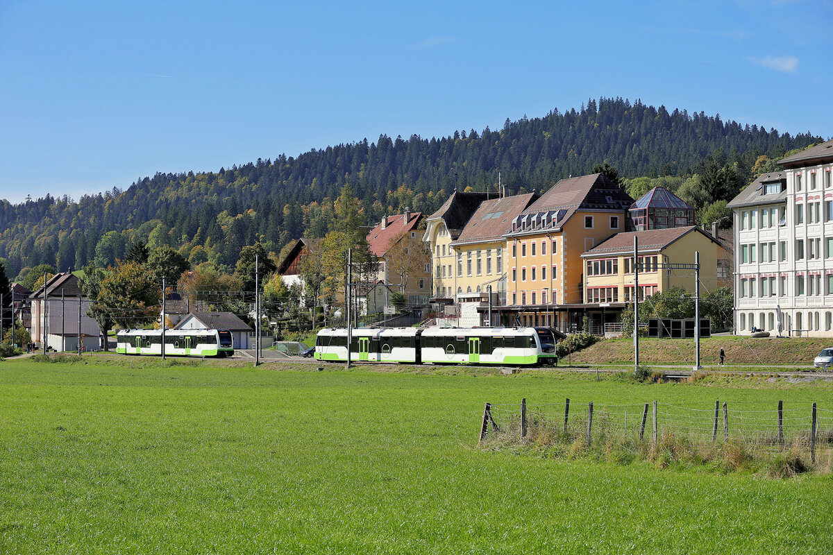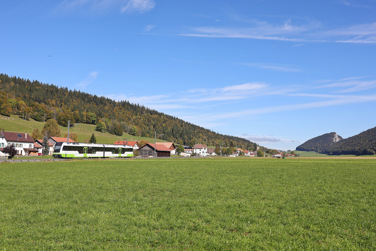 Damals noch was besonders: Ein "neuer" Domino als RE von Le Locle nach Neuchtatel kurz nach La Chaux-de-Fonds. Das Schmalspurgleis im Vordergrund führt nach Les Ponts de Martel.
