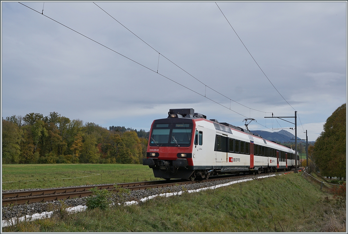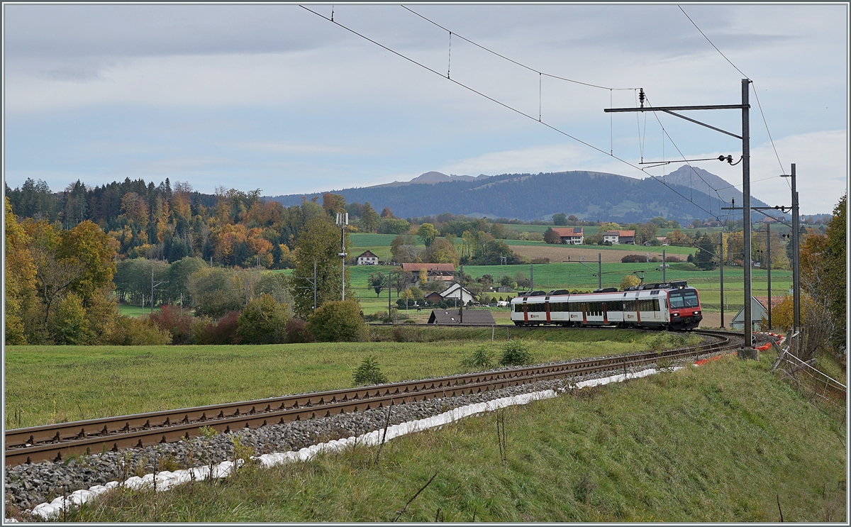In Palézieux von der "Hauptstrecke" Lausanne - Bern abgezweigt, fährt der SBB Domino in weiten Schleifen in Broyetal und wird in Kürze den Halt Palézieux Village erreichen. 22. Okt 2020