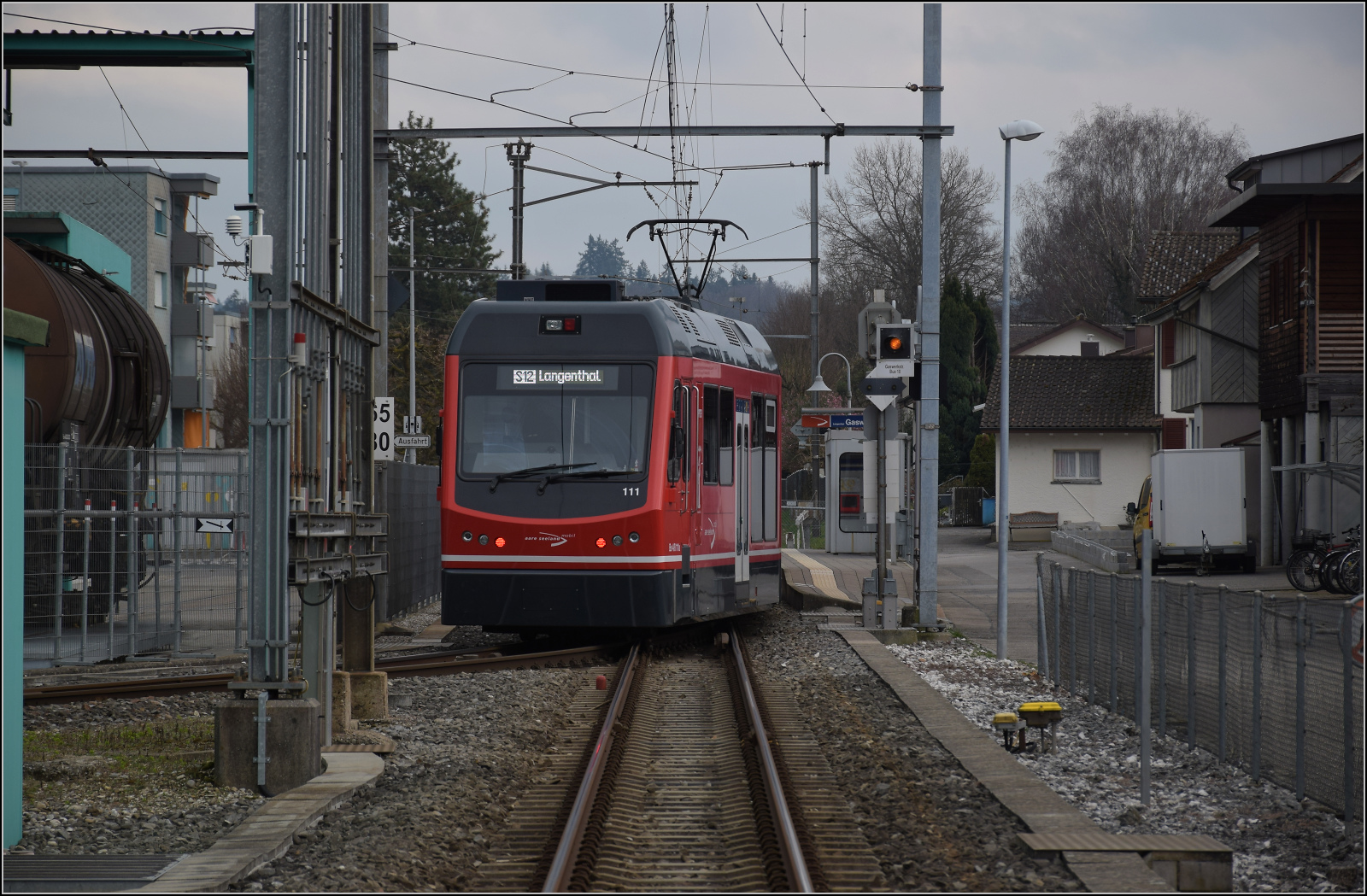 Warten auf das Bierlisi. Be 4/8 111 'Jupiter' in Langenthal Gaswerk fädelt von der Melchnauer Strecke auf die Langenthal-Jura-Bahn ein. Februar 2026.