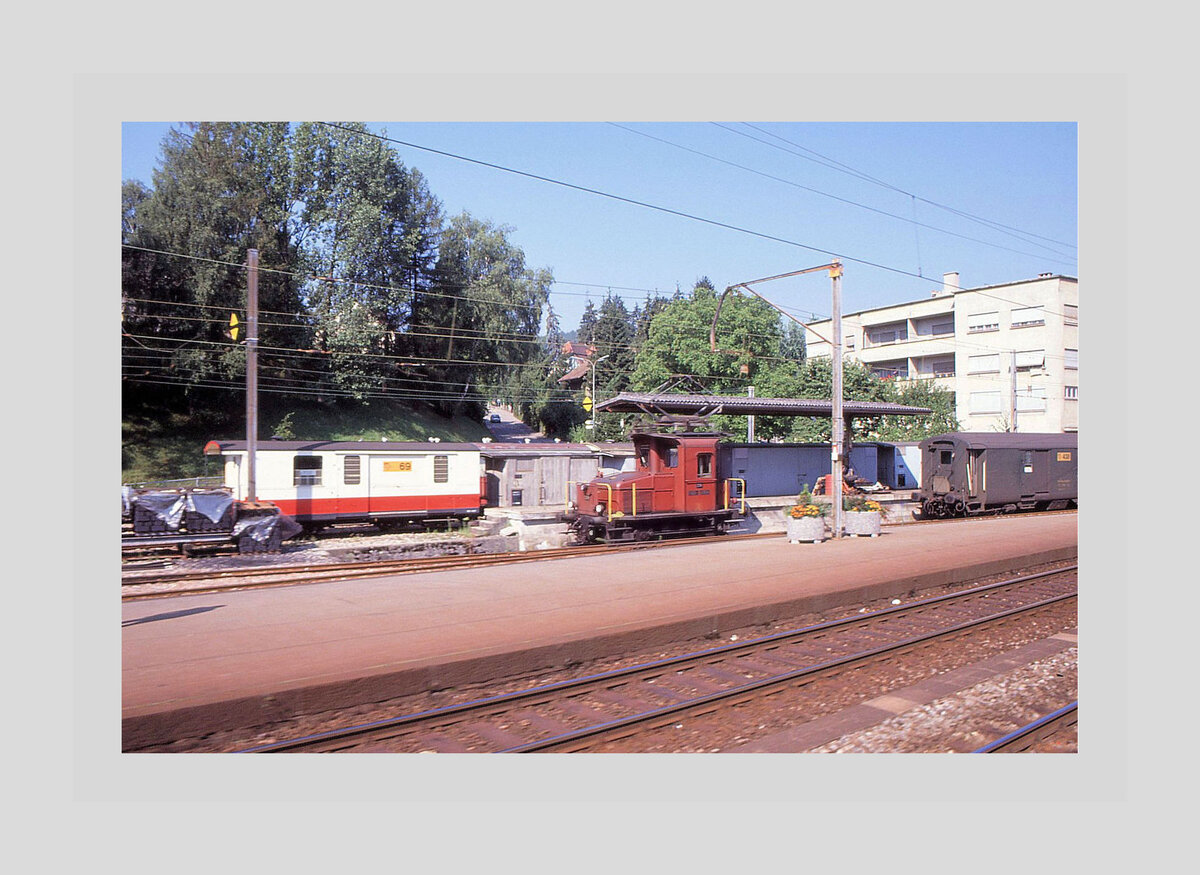 WB: Zufällige sowie sehr seltene Begegnung in Liestal Bahnhof im August 1984 zwischen einem Personenzug mit dem BDe 4/4 3 (1953) und einem Sondergüterzug mit der Dampflok 5 "G. THOMMEN" (1902).