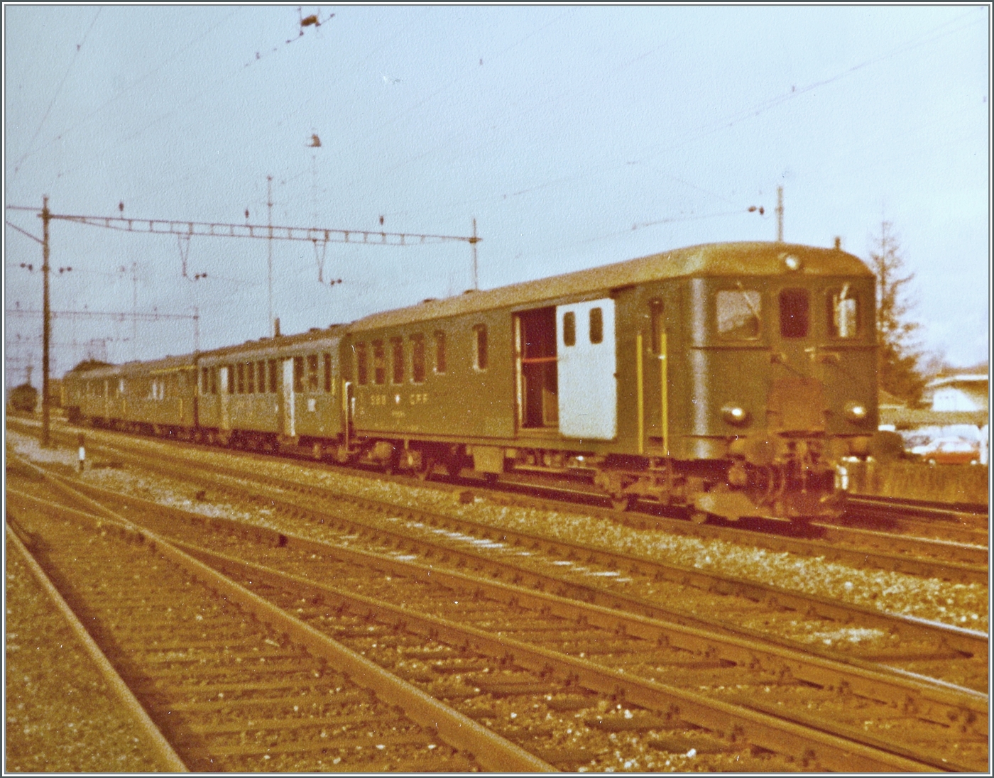 Solch "abenteuerliche" Züge fuhren damals im Regionalverkehr auf der Südbahn: Ein BDti, ein Leichtstahlwagen 2 Klasse, ein Leichtstahlwagen 1/2 Klasse und ein weiterer Leichtstahlwagen 2 Klasse, geschoben von einer Ae 3/5 bildeten den Regionalzug Brugg - Lenzburg (Fahrtrichtungswechsel) - Muri. Das Analogbild wurde in Dottion-Dintikon mit der 110-Film Knipse aufgenommen.