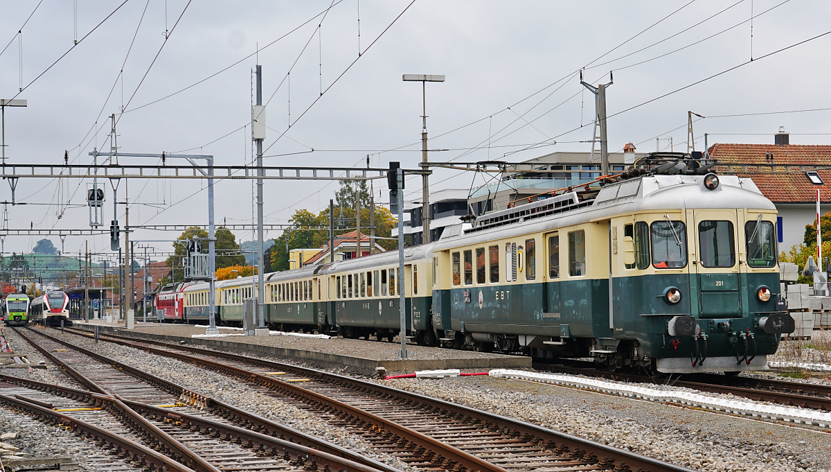 Der BDe 4/4 II 201 "Burgdorf" des Vereins Pendelzug Mirage (VPM) fährt am 11.10.2025 mit dem Bierzug aus dem Bahnhof Murten aus. Am 14.09.1966 wurde er als als BDe 4/4 82 an die Südostbahn geliefert. Diese Sonderfahrt der Bier Arena Murten startete in Murten und führte über Payerne, Yverdon, Neuchatel und Lyss zurück zum Ausgangspunkt. Horst Lüdicke