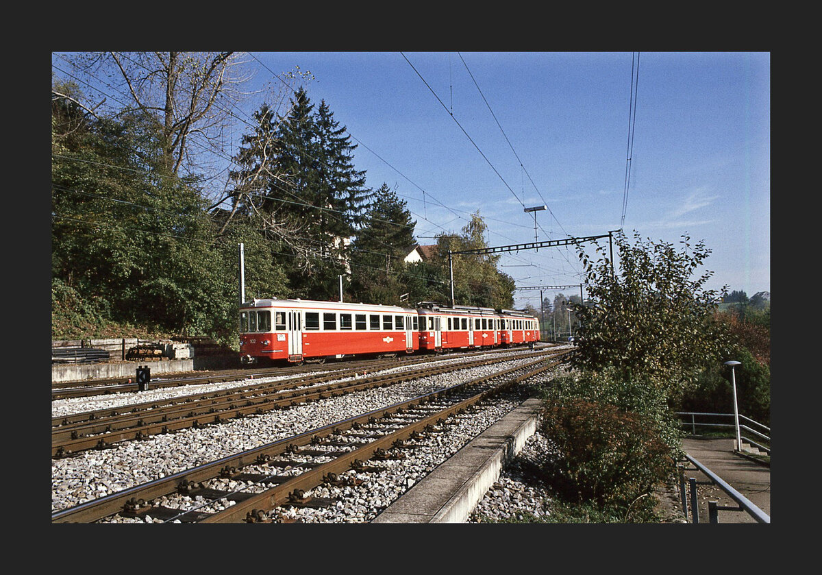 Forchbahn vor dem Depot Forch. Der BDe4/4 9 von 1948 (SWS/MFO, 1.Generation), der 1982 zum Schneepflugwagen umgebaut wurde. Es heisst, diese Wagen seien mit den 3 Sernftalbahnwagen verwandt. 25.März 1970