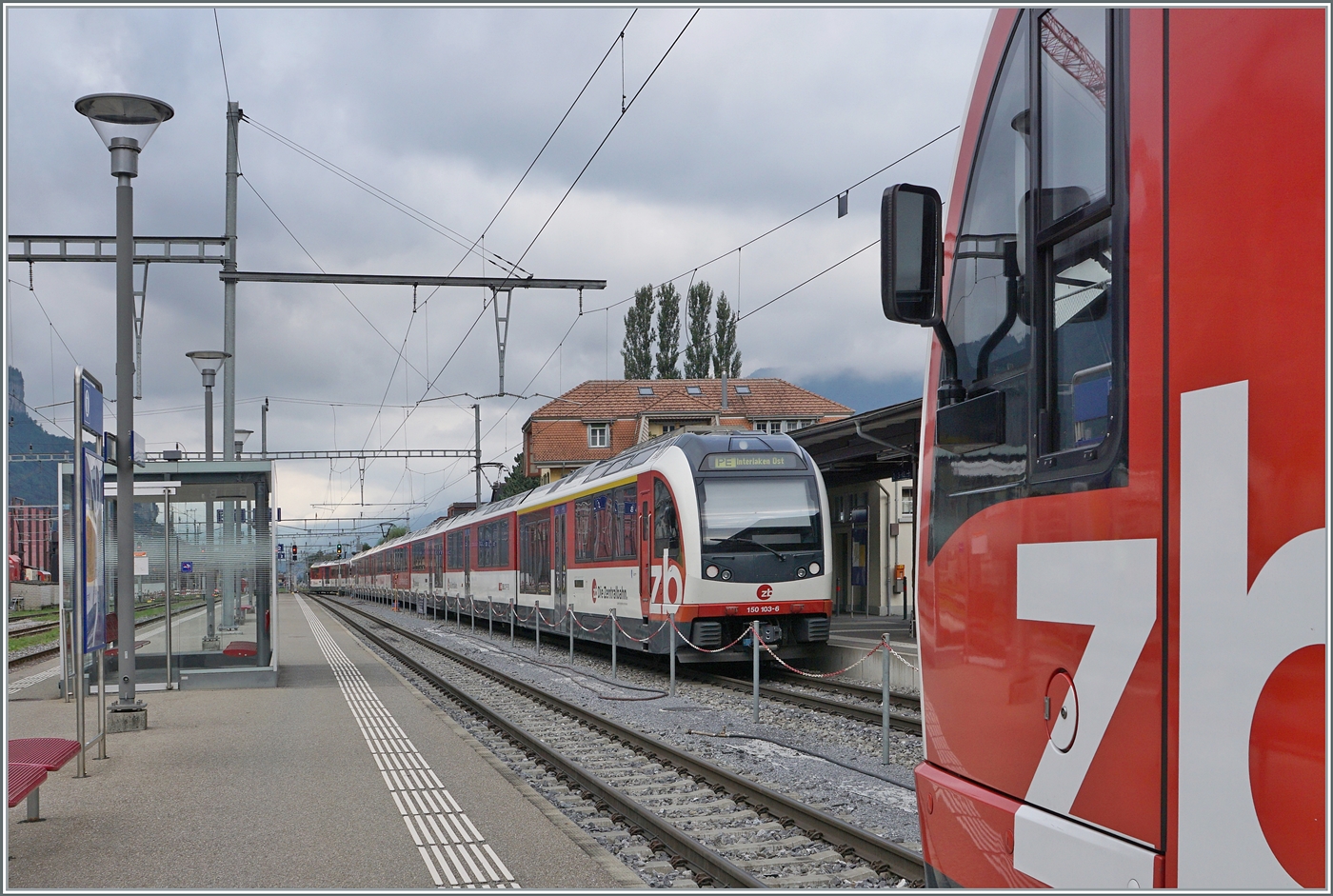 Der IR von Interlaken Ost nach Luzern bestehend aus dem Zentralbahn "Adler" 150 101-1 und dem "Fink" 160 002-8 erreicht Meiringen, wo für die Weiterfahrt Richtung Brünig die Fahrtrichtung gewechselt wird.