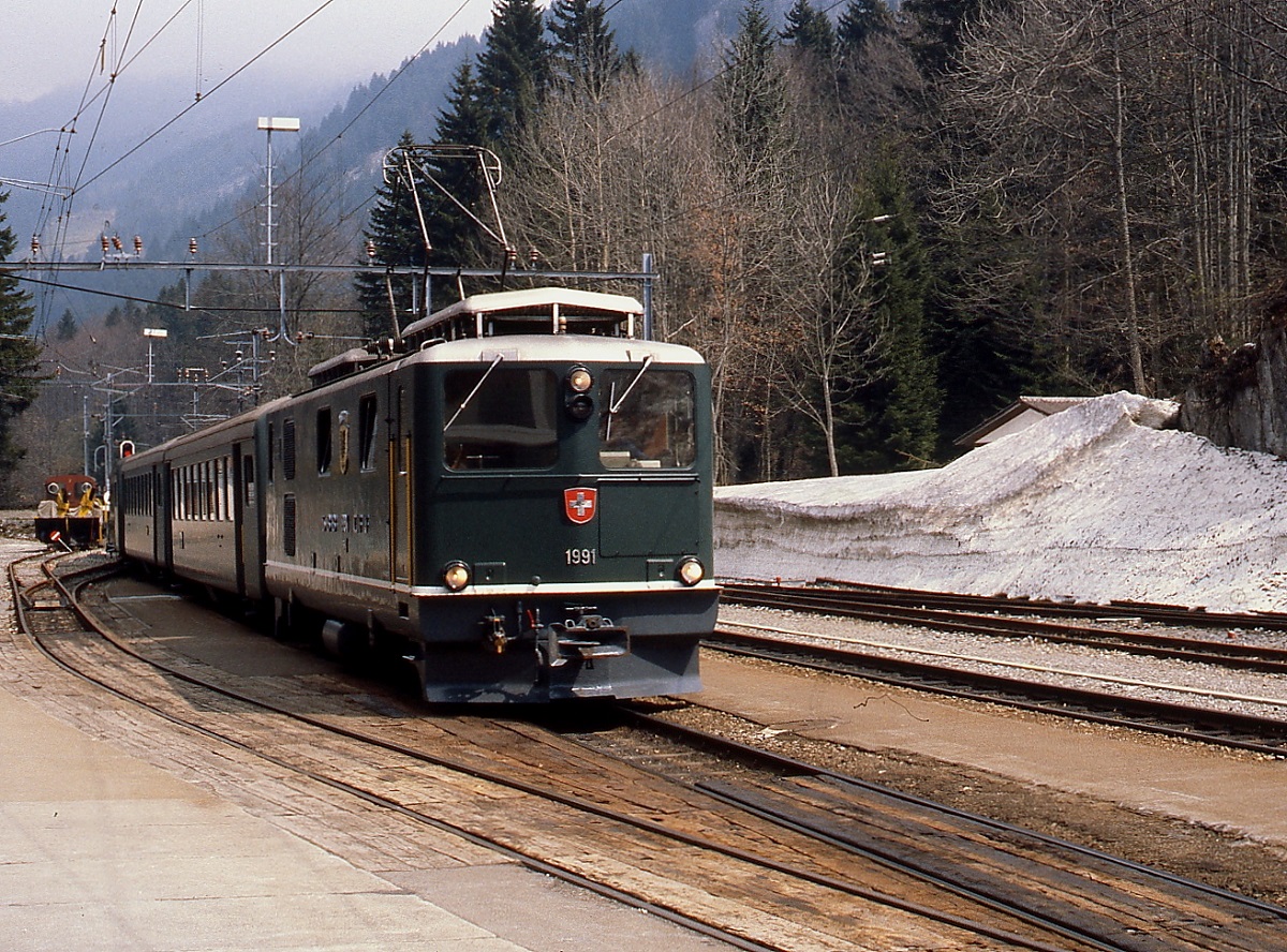 Im Zahnradabschnitt zwischen dem Brünigpass und Lungern befördert ein Deh 4/6 der Brünigbahn Anfang Mai 1981 einen Regionalzug nach Luzern Horst Lüdicke