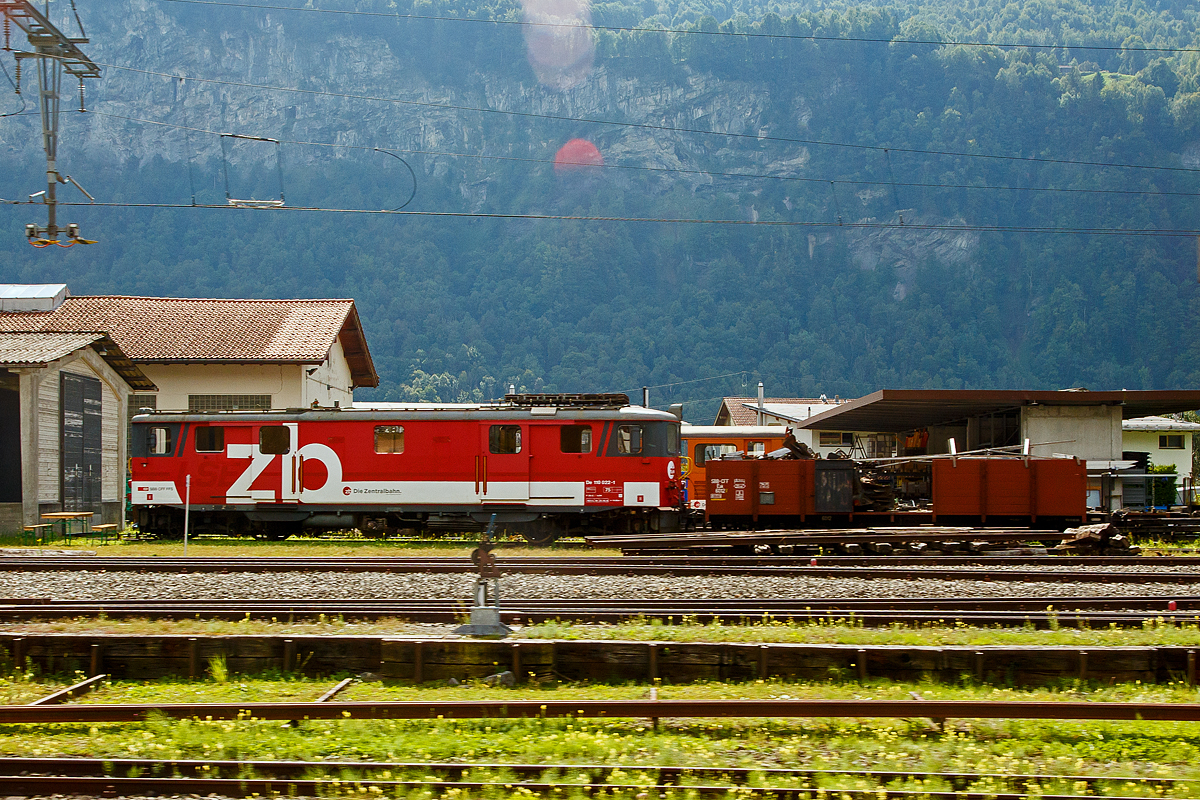 Der nun fast 80-jährige Gepäcktriebwagen De 110 022-1 (ex LSE De 4/4 122) der vor dem Umbau auf reinen Adhäsionsbetrieb ex SBB Deh 4/6 907 bzw. Fhe 4/6 907, steht am 09.09.2021 in Meirigen. Das Bild wurde durch die Scheibe aus einem zb-Zug gemacht.