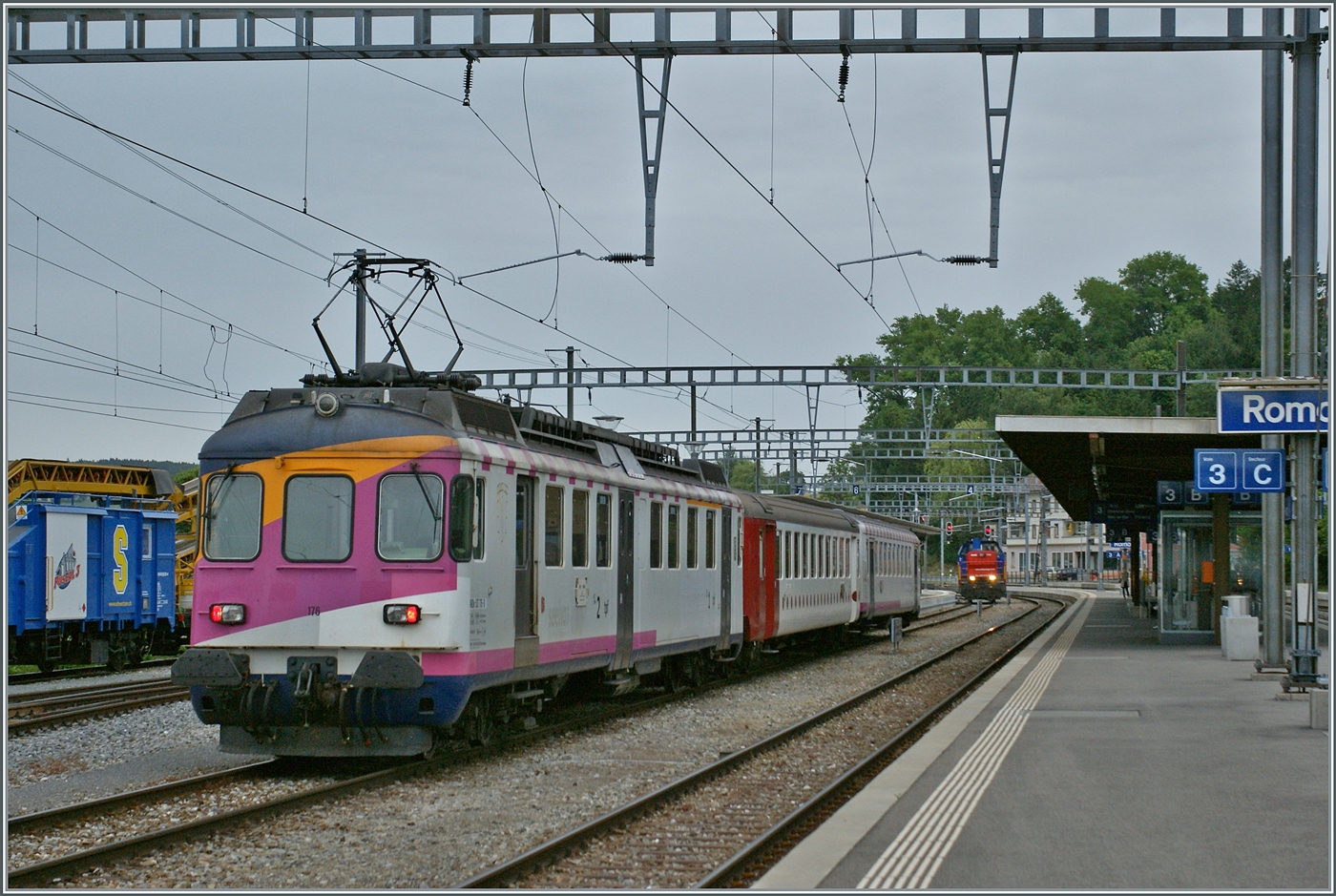 Der TPF Regionalzug in den ex MThB Farbgebung (mit Ausnahme des TPF Mittelwagens) von Bulle kommend am Ziel der Fahrt in Romont angekommen.