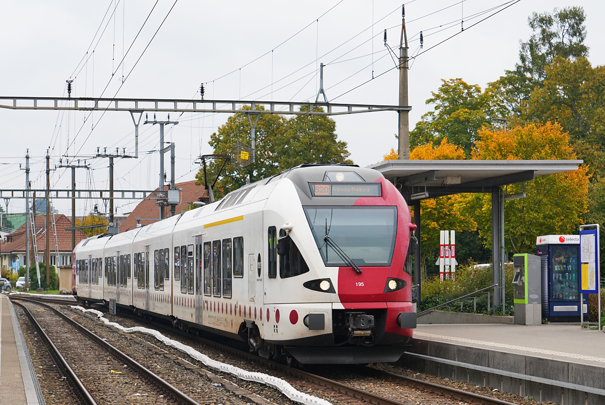An der gleichen Stelle der TPF RABe 527 198 "Groupe Grisoni" und der nicht zu sehende RABe 527 192 als RER von Broc Village nach Bulle.