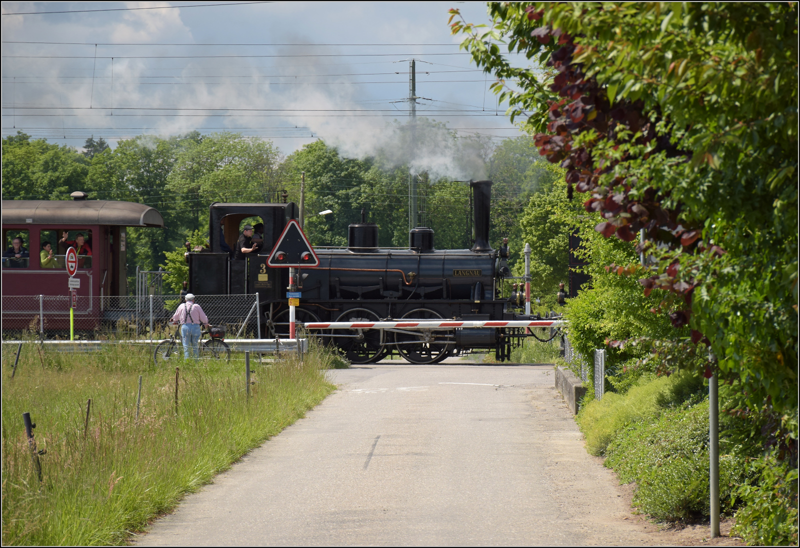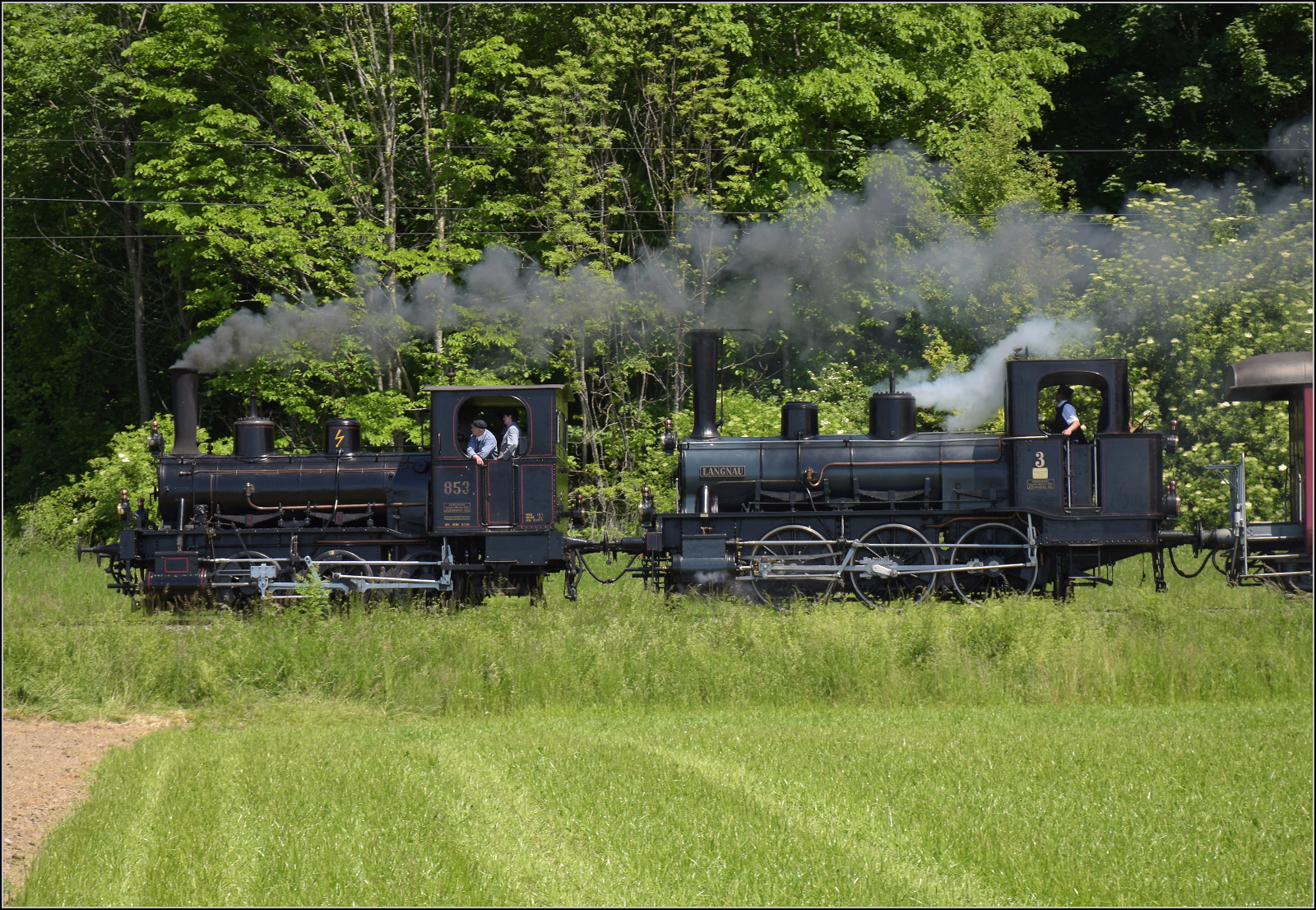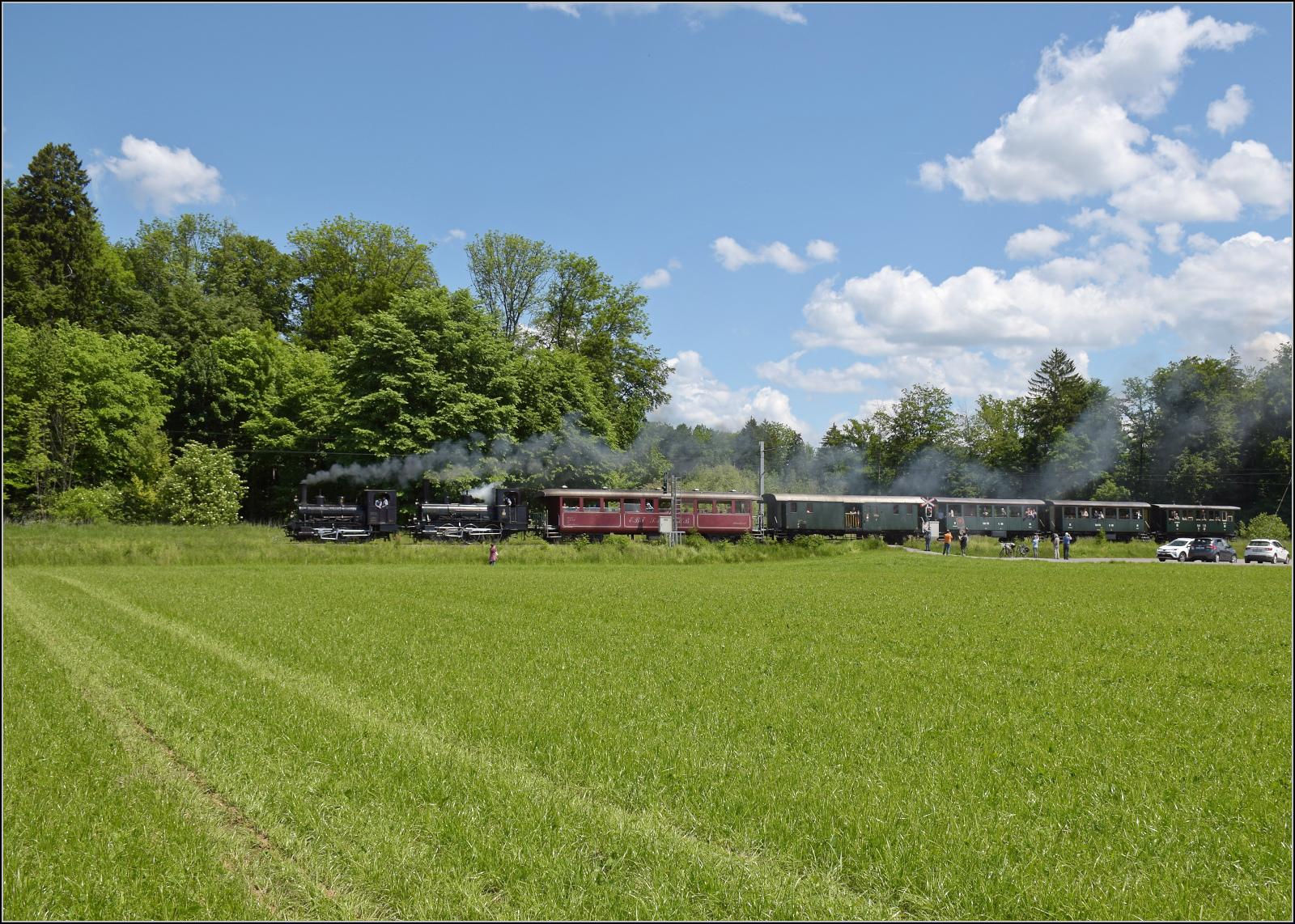 RM: Anlässlich des Eidgenössischen Jodlerfestes vom 22. bis 24. Juni 1990 in Solothurn wurden die Züge zwischen Solothurn und Burgdorf verstärkt. Der 6Wagenzug mit zwei RBDe 566 wurde zwischen Utzenstorf und Aefligen verewigt (24. Juni 1990).