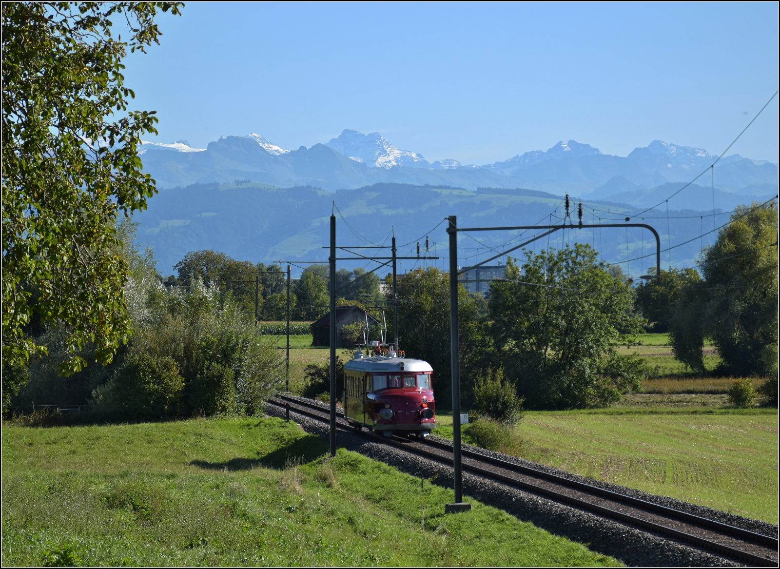 Der Rote Pfeil aus Balsthal durfte beim Jubiläum mitfeiern. Der Aussendienst auf der Kempttalbahn zur Vervollständigung einer Rundfahrt über die Tösstalbahn und Uerikon-Bauma-Bahn zeigt RCe 2/4 607 bei Auslikon nahe dem Päffikersee. Im Hintergrund ist noch hinter dem Baum der Clariden (3267 m), dann sind der Chammliberg (3215 m), in Bildmitte Gross Schärhorn (3292 m)und Chli Schärhorn (3232 m), dann Höch Windgällen (2764 m) und rechts der Gross Ruchen (3137 m) prominent im Bild. September 2025. Olli