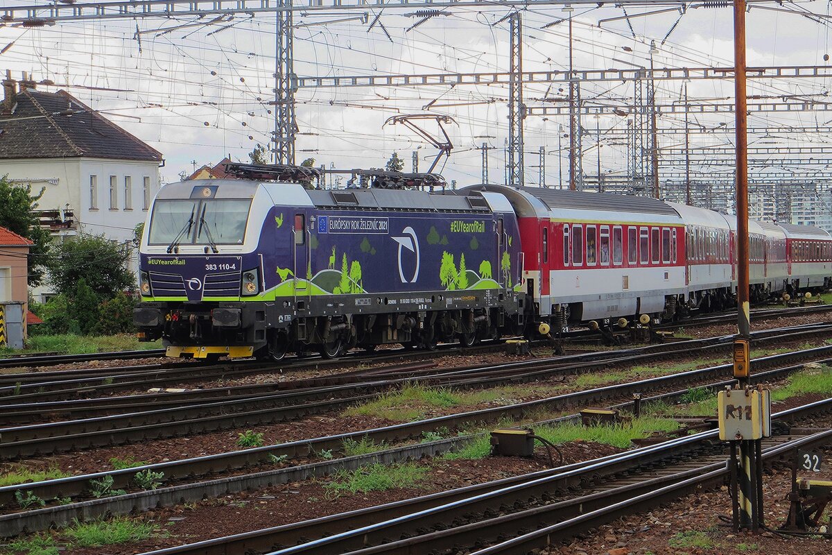 ZSSK 383 110 wirbt beim Einfahrt in Bratislava hl.st. am 27 Augustus 2021 für das Europäisches Jahr der Eisenbahn.