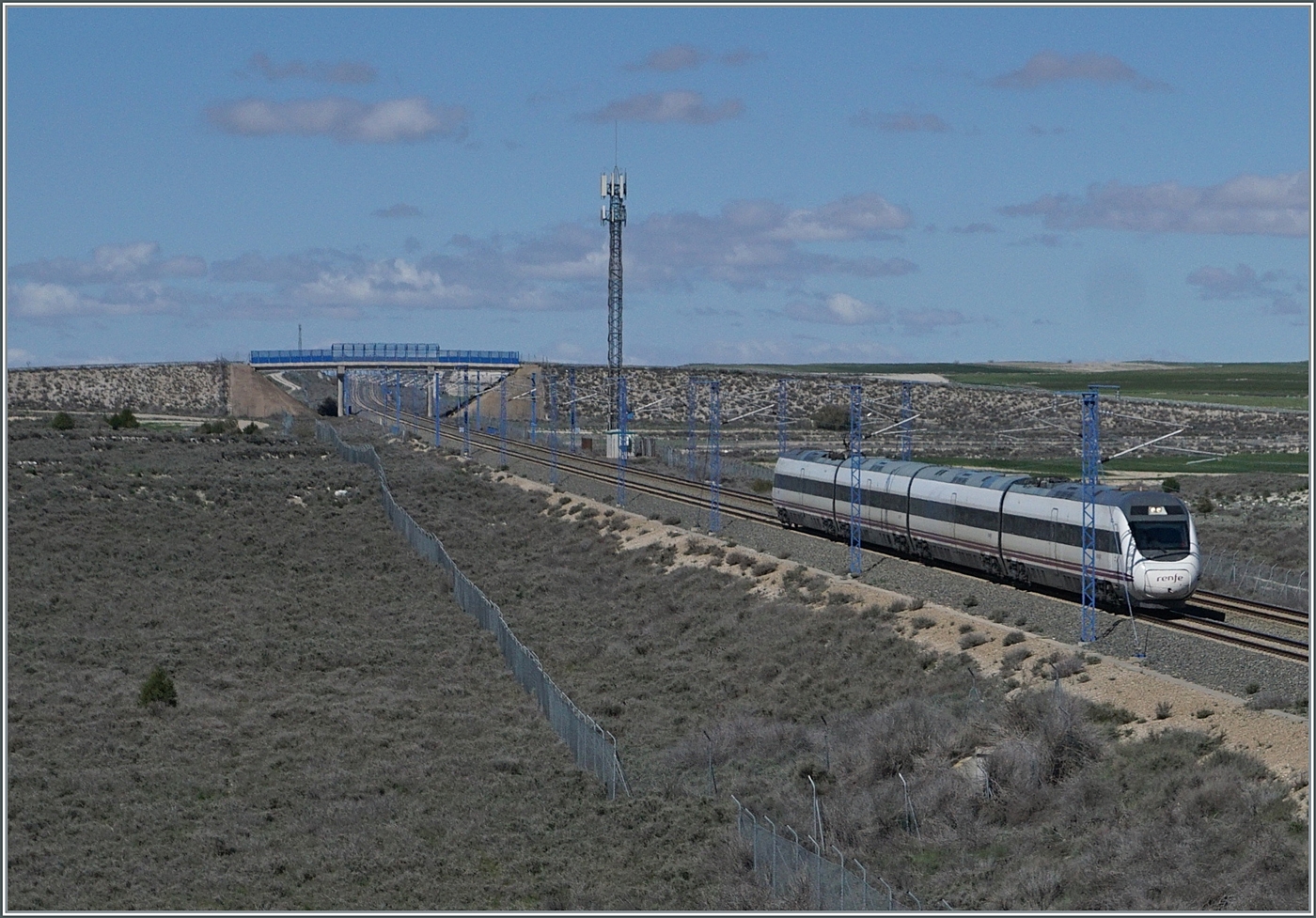 Auf der Schnellfahrstrecke Madrid - Barcelona bei km 370.55 ist der Alvia 533 von San Sebastian (ab 07:02) nach Barcelona Sants (an 13:09) unterwegs. Der vierteilige Triebzug ist Umspurbar und gehört zur Serie 120 (Alvia).