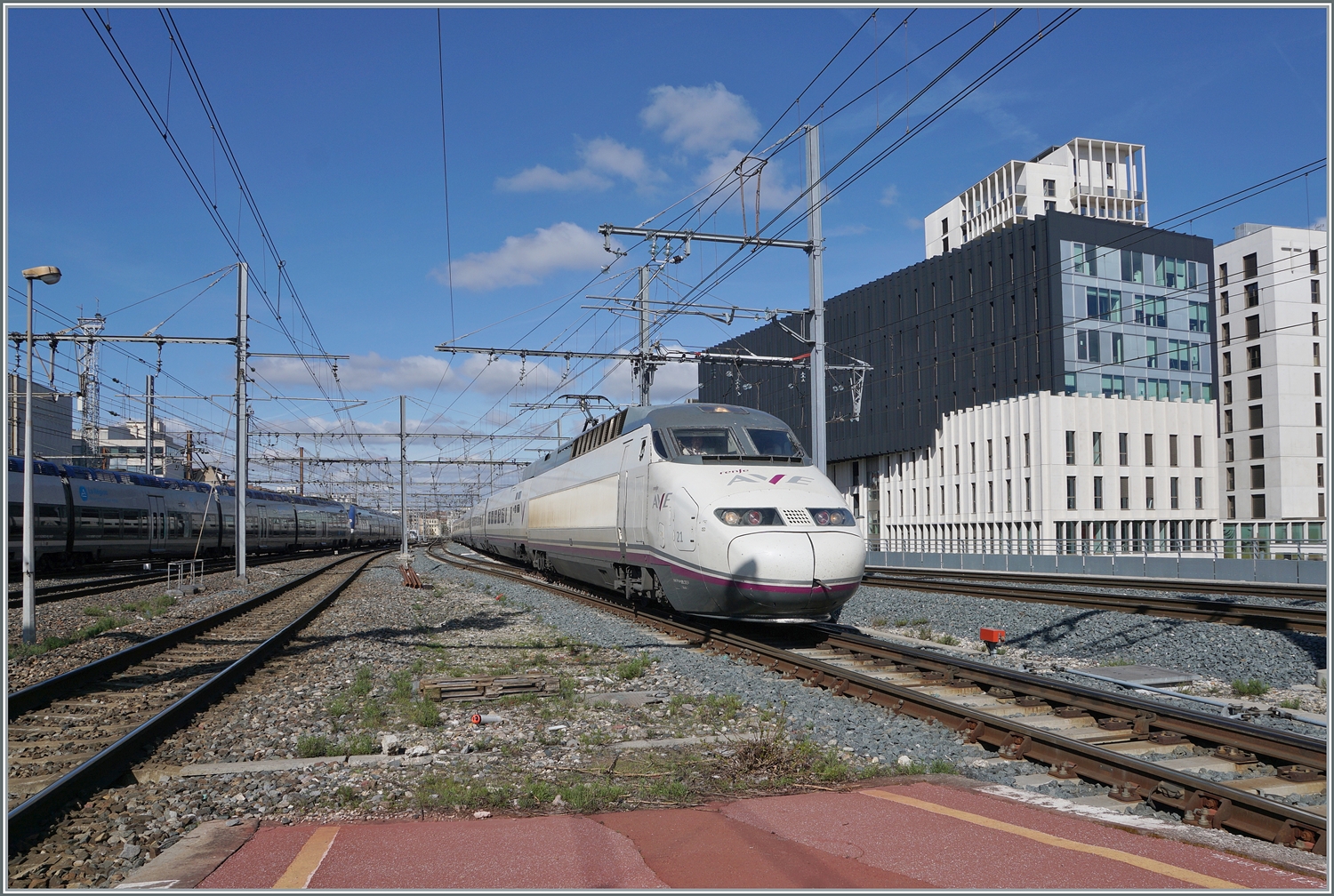 Während links im Bild der SNCF 27672 und ein weiterer als TER in Lyon Part Dieu ankommen, erreicht der RENFE AVE 100 221-1 (9 6 71 9-100 221-1) vom (ehemaligen) Bahnhof Lyon Brottaux kommend zur Bereitstellung den Bahnhof Lyon Part Dieu. Der AVE Zug war kurzzeitig in Lyon Brottaux abgestellt. Der RENFE AVE 100 122 wird als AVE 9742 von Lyon (ab 14:32) nach Barcelona Sants (an 19:34) fahren.