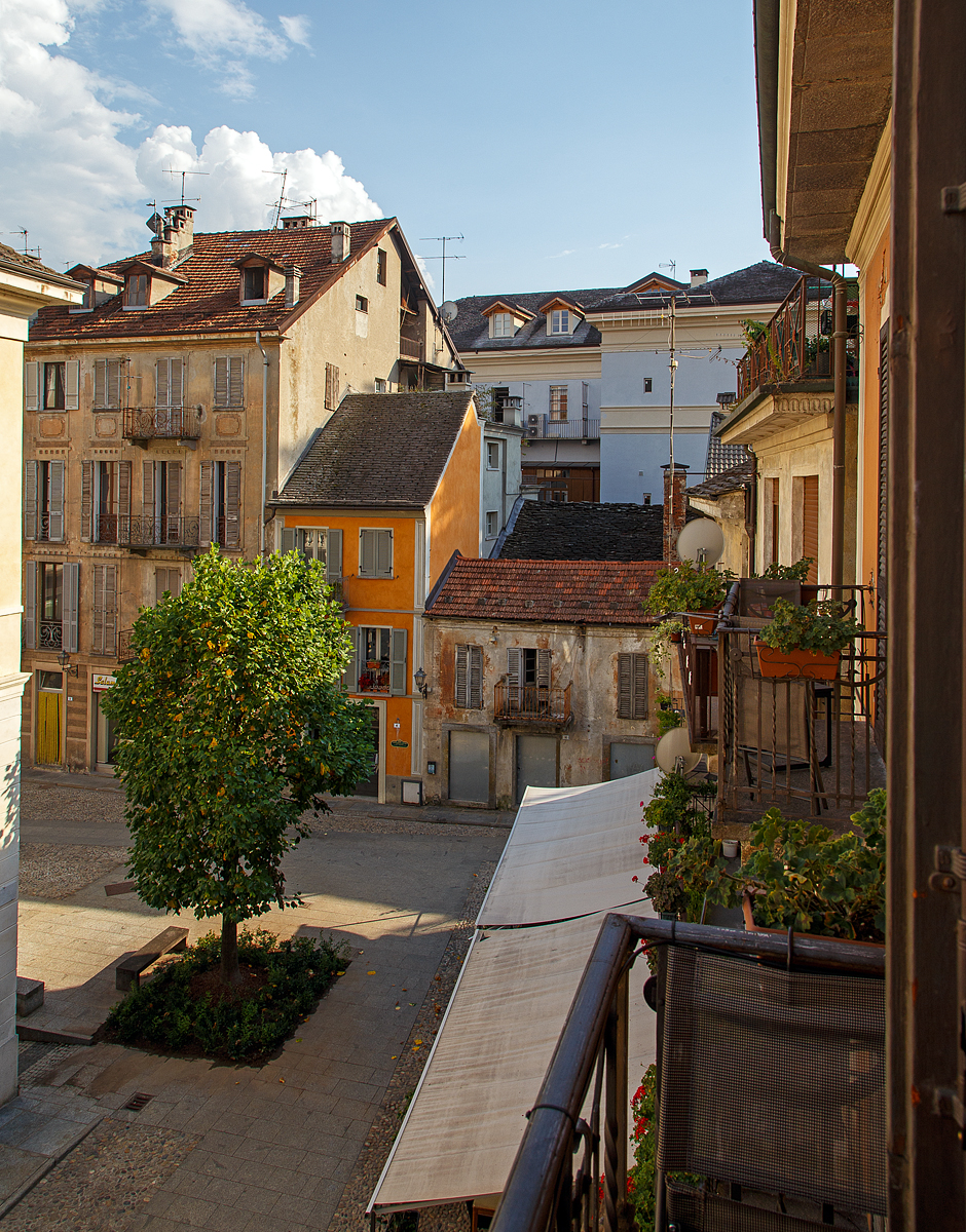 Ein abendlicher Blick auf den Marktplatz (Piazza del Mercato) in der Altstadt von Domodossola am 07.09.2021.