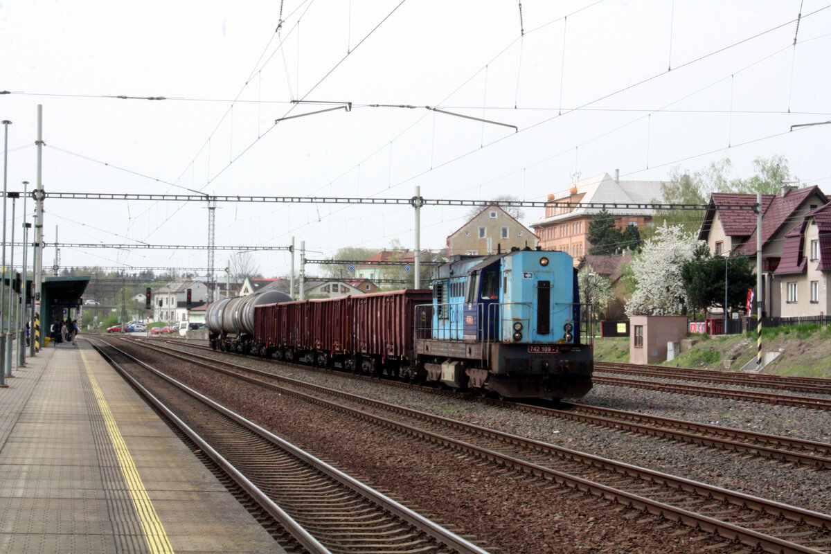 742 109 von CD Cargo mit einen Lumpensammler im Bahnhof Sokolov am 9.4.24
