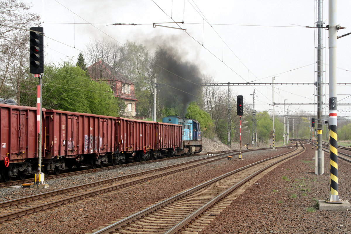 742 109 von CD Cargo verlässt mit einen Lumpensammler den Bahnhof Sokolov am 9.4.24