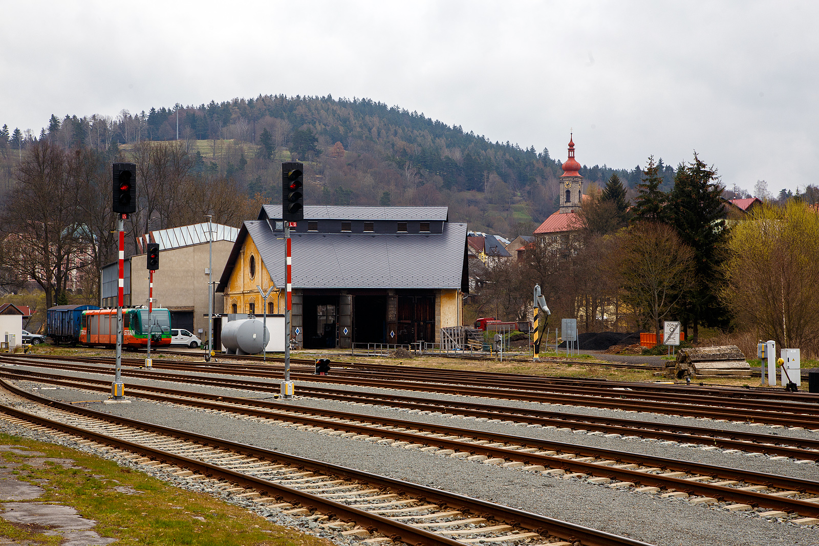 Der beschrankte Bahnübergang der Bahnstrecke Mariánské Lázně–Karlovy Vary (Marienbad–Karlsbad) – SŽDC 149, nahe dem Bahnhof Bečov nad Teplou (Petschau) am 20.04.2023.
