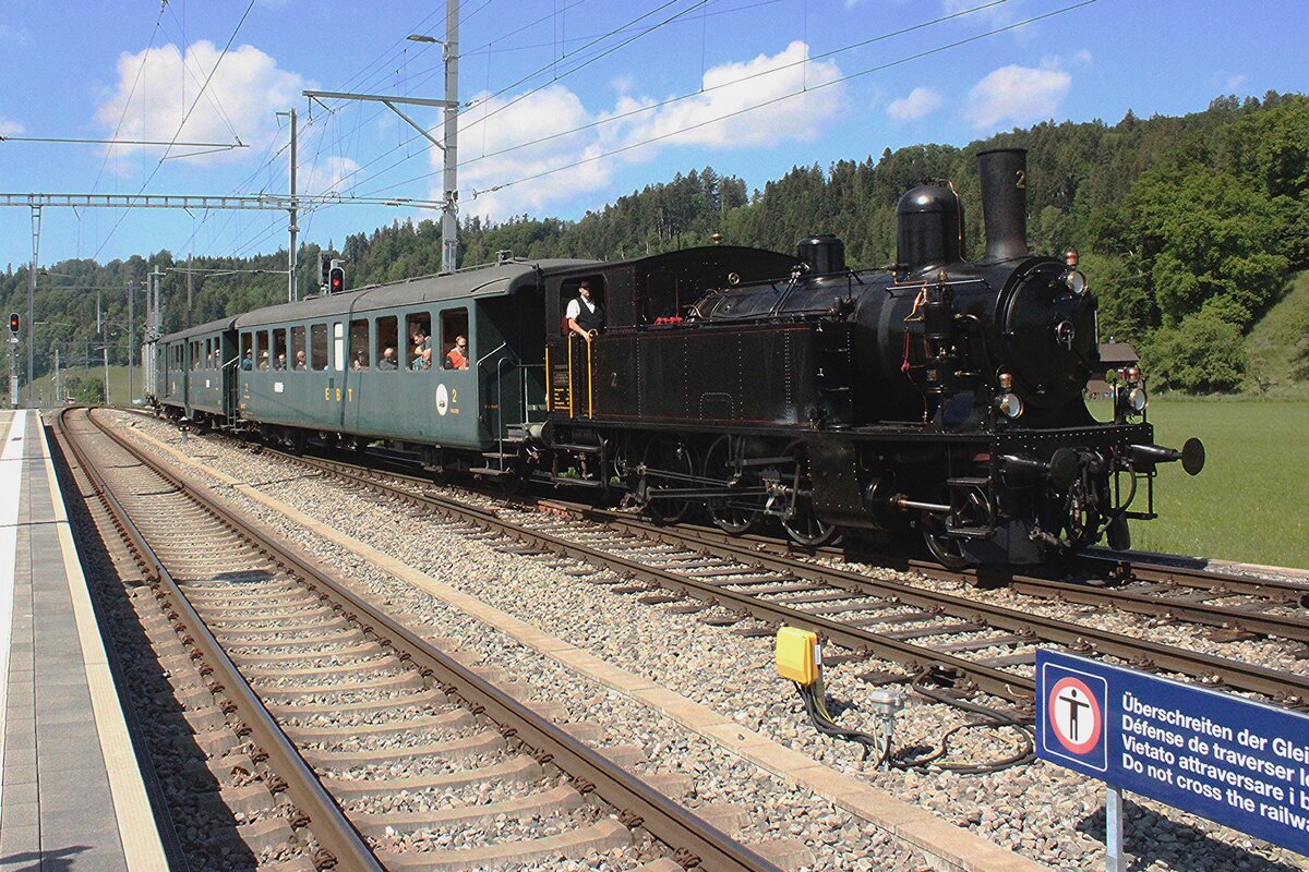 In Sumiswald findet der traditionelle Gotthelf-Märit statt und für diesen Markt fährt die  Emmentalbahn  auf der Strecke Sumiswald Grünen - Wasen i.E. einige Dampfzüge. Das Bild zeigt die E 3/3 853 des Vereins Dampf Bahn Bern beim Umfahren in Sumiswald Grünen.
