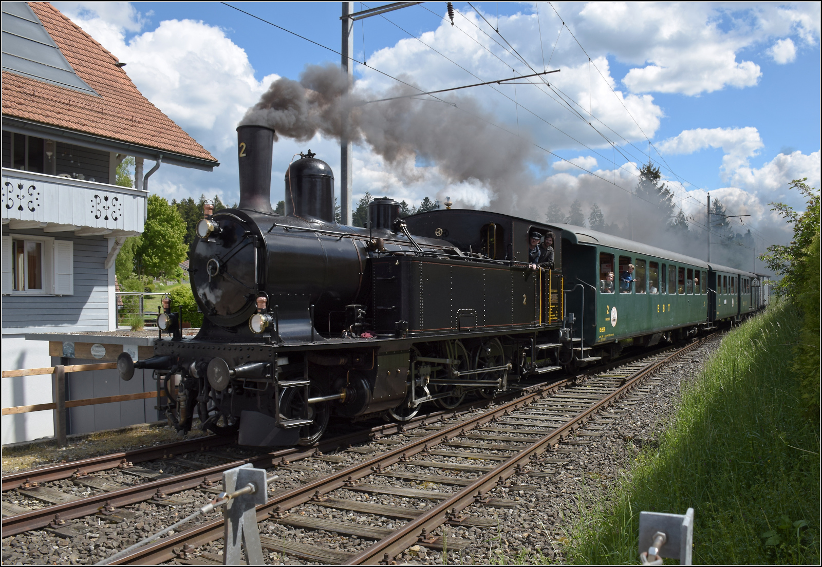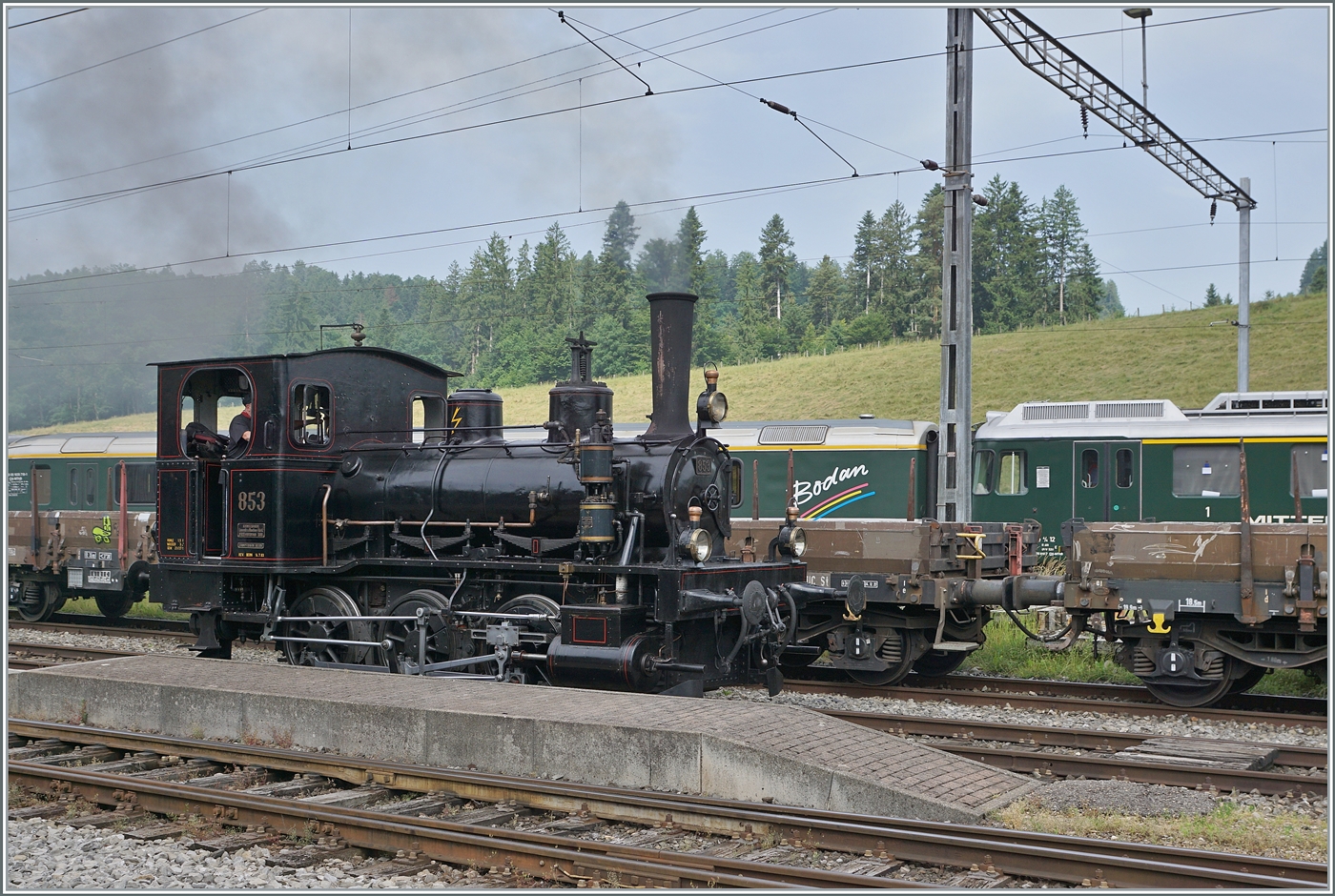 In Sumiswald findet der traditionelle Gotthelf-Märit statt und für diesen Markt fährt die "Emmentalbahn" auf der Strecke Sumiswald Grünen - Wasen i.E. einige Dampfzüge. Das Bild zeigt die E 3/3 853 des Vereins Dampf Bahn Bern beim Umfahren in Sumiswald Grünen. 14. Juni 2025